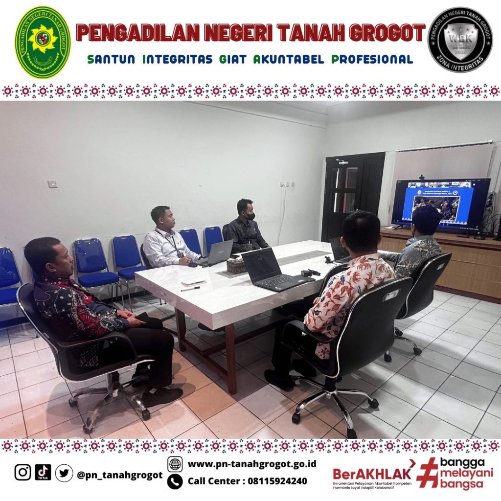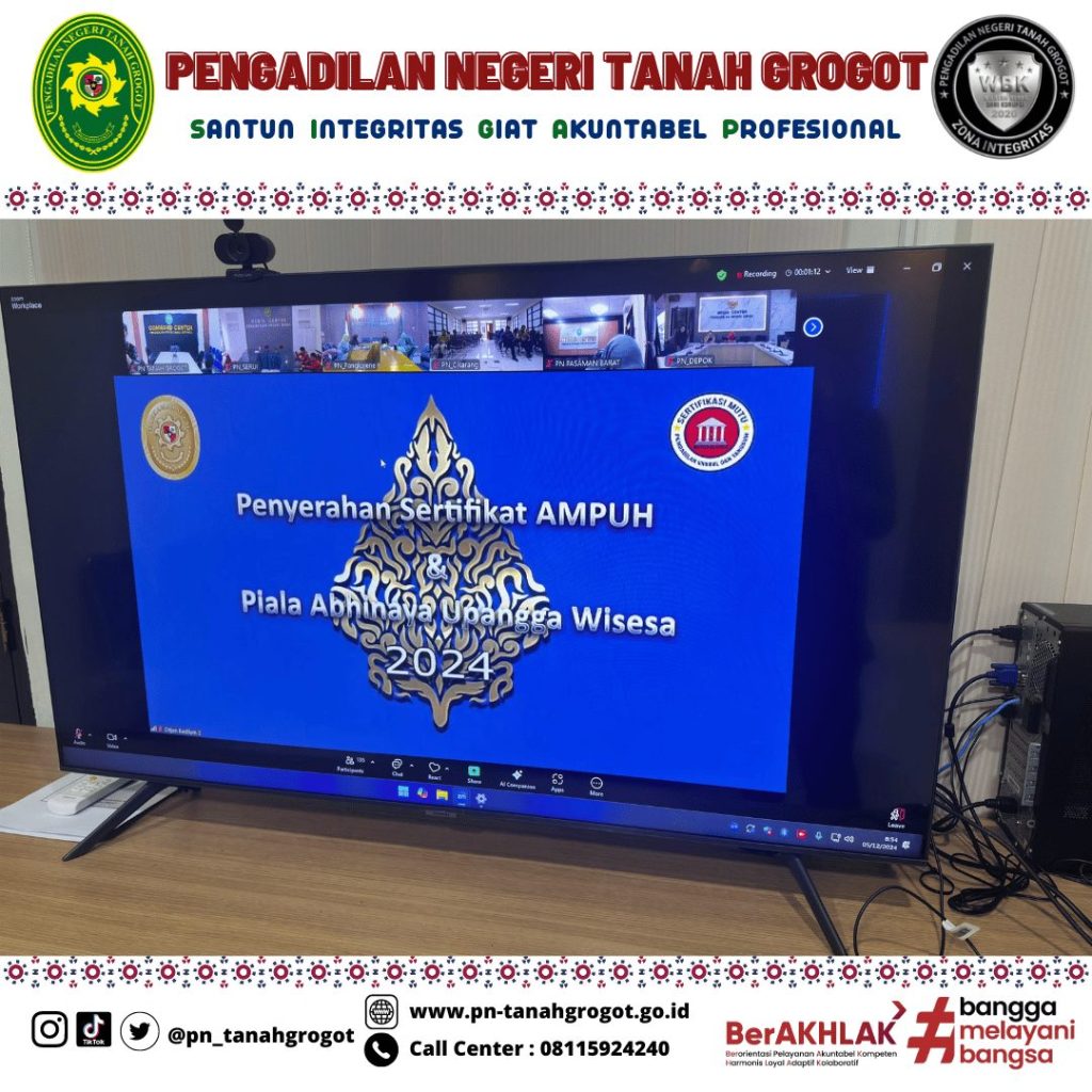 Bertempat di ruang Command Center Pengadilan Negeri Tanah Grogot, Wakil Ketua Pengadilan Negeri Tanah Grogot, Bapak Andi Hardiansyah, S.H., M.Hum. beserta dengan Para Hakim Pengadilan Negeri Tanah Grogot mengikuti kegiatan undangan penyerahan penghargaan sertifikat AMPUH berpredikat unggul dan penghargaan Abhinaya Upangga Wisesa 2024 yang diselenggarakan oleh Dirjen Badilum Mahkamah Agung Republik Indonesia secara daring.