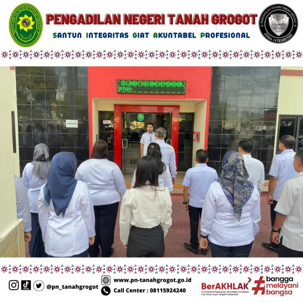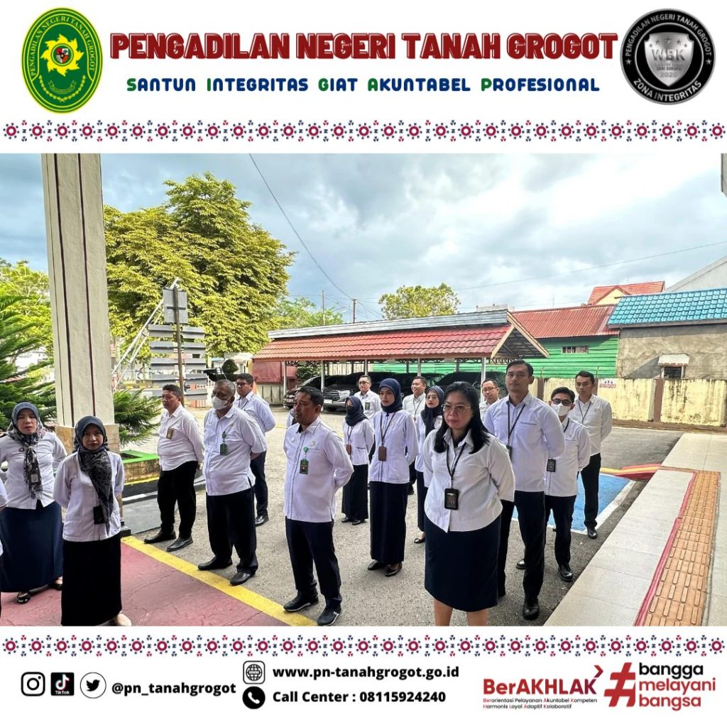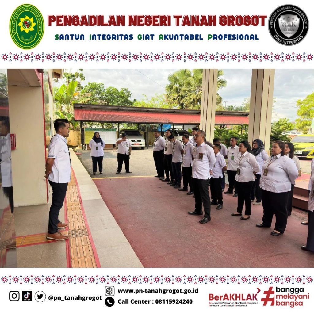 Pada hari Senin tanggal 30 Juni 2025 tepat pukul 08.00 WITA bertempat di halaman kantor Pengadilan Negeri Tanah Grogot dilaksanakan kegiatan apel pagi. Bertindak sebagai Pembina Apel Hakim Pengadilan Negeri Tanah Grogot Bpk. Wisnhu Adi Dharma, S.H. dan dalam apel pagi tersebut diikuti oleh Ketua, Wakil Ketua, Para Hakim, Panitera, Sekretaris, ASN, PPNPN dan Honor Pengadilan Negeri Tanah Grogot.
