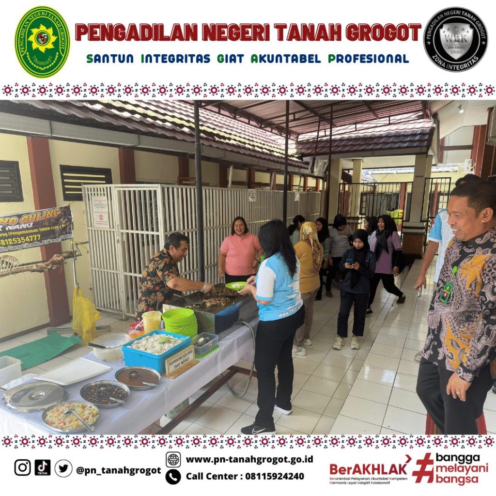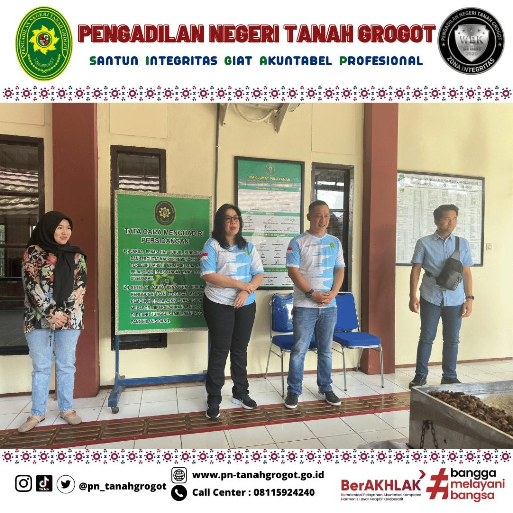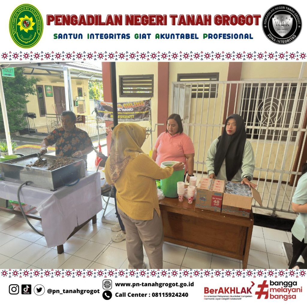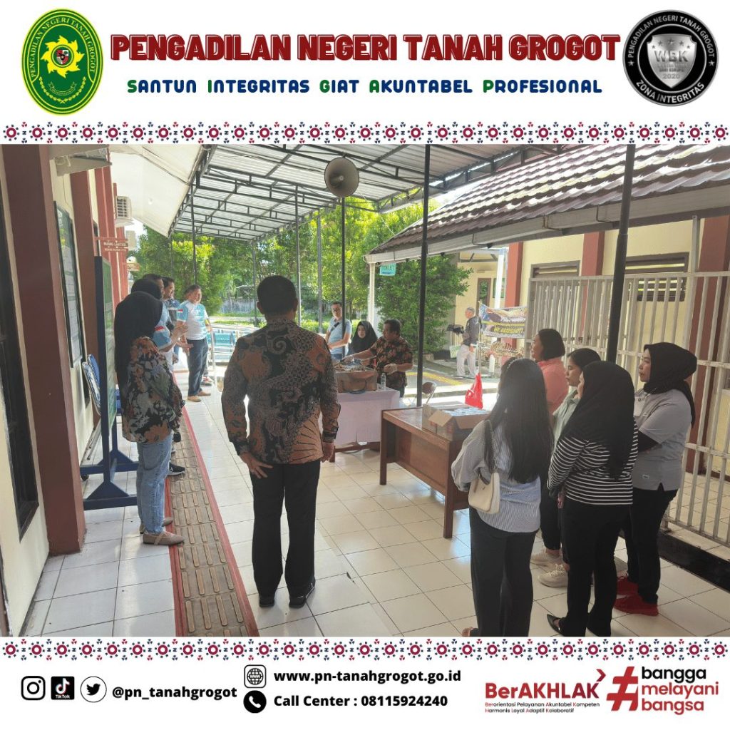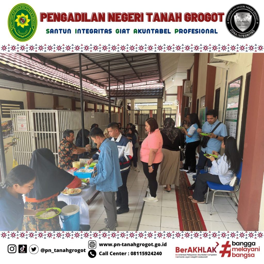 Pada hari Jum’at tanggal 20 Desember 2024 pukul 08.00 WITA bertempat di samping gedung Pengadilan Negeri Tanah Grogot diadakan kegiatan kerja bakti membersihkan lingkungan kantor. Kegiatan pun berlanjut ke acara makan bersama dalam rangka merayakan keberhasilan Pengadilan Negeri Tanah Grogot dalam meraih predikat “Unggul” untuk sertifikasi AMPUH dan Terbaik II untuk capaian nilai EIS (Evaluasi Implementasi SIPP) Tahun 2024 untuk kategori Pengadilan Negeri Kelas II dengan Perkara 1 s/d 500.