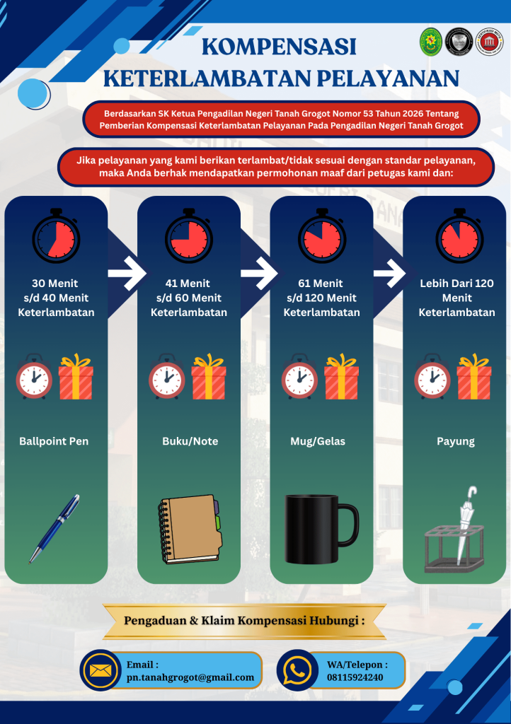 Demi mewujudkan Pelayanan yang Prima, Pengadilan Negeri Tanah Grogot telah menetapkan ketentuan pemberian kompensasi kepada Pengguna Layanan yang menerima Layanan. Hal ini berdasarkan pada Surat Keputusan Ketua Pengadilan Negeri Tanah Grogot Nomor 53/KPN.W18-U4/SK.OT1.6/I/2026 tentang Kompensasi Keterlambatan Pelayanan di Lingkungan Pengadilan Negeri Tanah Grogot. Berikut merupakan bentuk kompensasi yang berikan berupa :