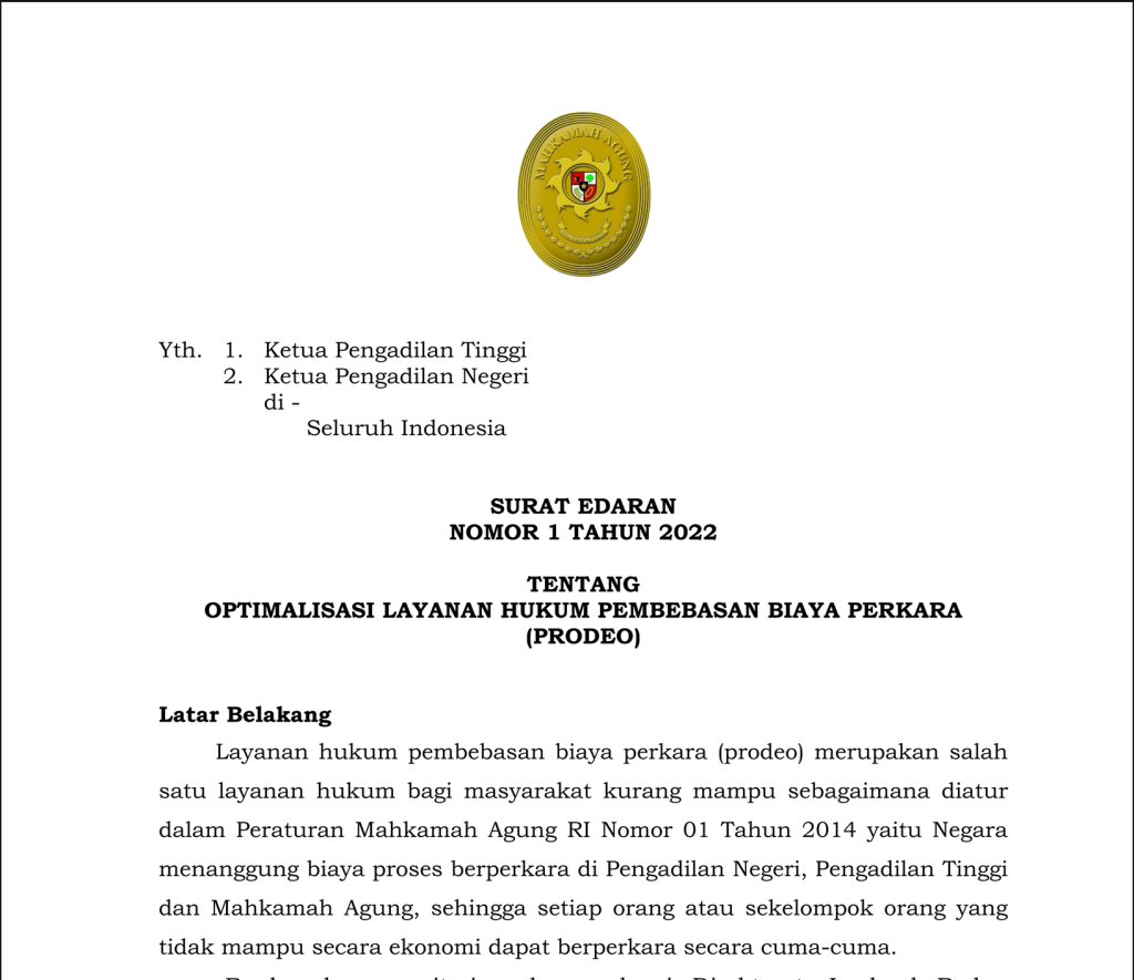 SE Dirjen Nomor 1 Tahun 2022 tentang Optimalisasi Layanan Hukum Pembebasan Biaya Perkara (Prodeo) menyatakan Pencari keadilan yang dapat diberikan layanan hukum pembebasan biaya perkara terdiri dari orang perseorangan atau sekelompok orang yang secara ekonomi tidak mampu atau memiliki kriteria miskin sebagaimana ditetapkan oleh Badan Pusat Statistik atau penetapan upah minimum regional atau program jaring pengaman sosial lainnya, yang memerlukan bantuan untuk menangani dan menyelesaikan masalah hukum di pengadilan.