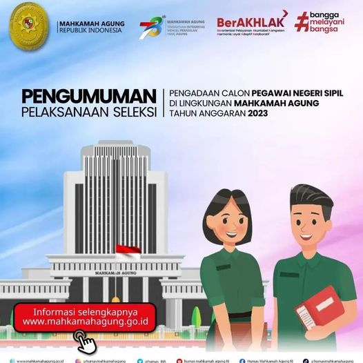 Jakarta-Humas: Berdasarkan Keputusan Menteri Pendayagunaan Aparatur Negara dan Reformasi Birokrasi Republik Indonesia Nomor 544 Tahun 2023 tentang Penetapan Kebutuhan Pegawai Aparatur Sipil Negara di Lingkungan Pemerintah Pusat Tahun Anggaran 2023, Mahkamah Agung RI memberikan kesempatan kepada Warga Negara Indonesia yang memenuhi syarat untuk mengikuti seleksi Calon Pegawai Negeri Sipil (CPNS) Mahkamah Agung RI.