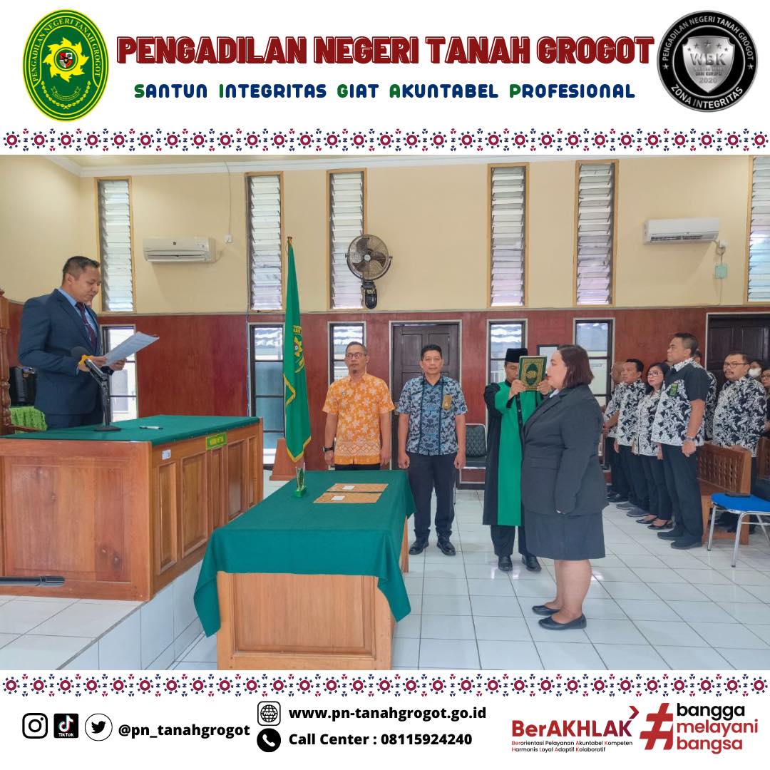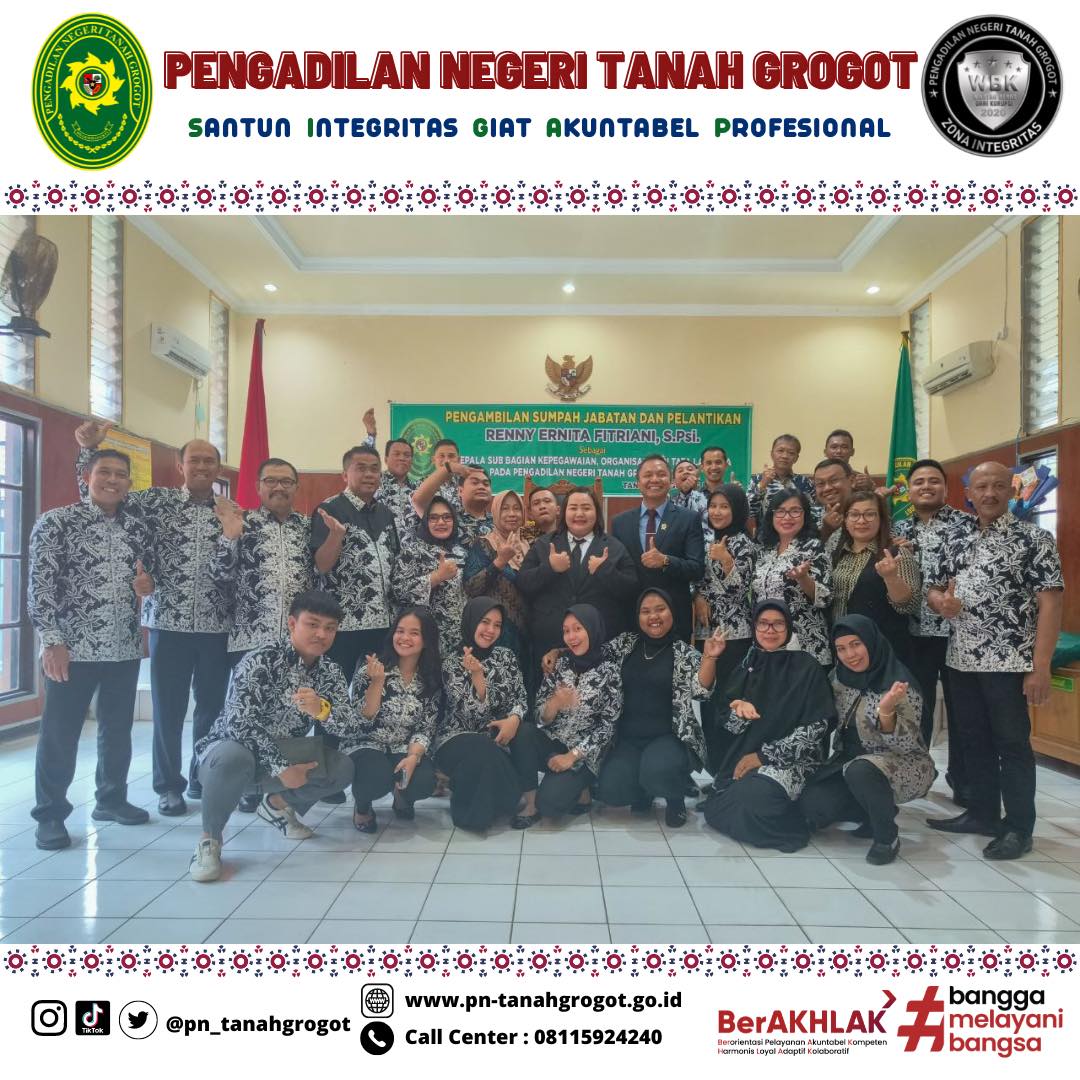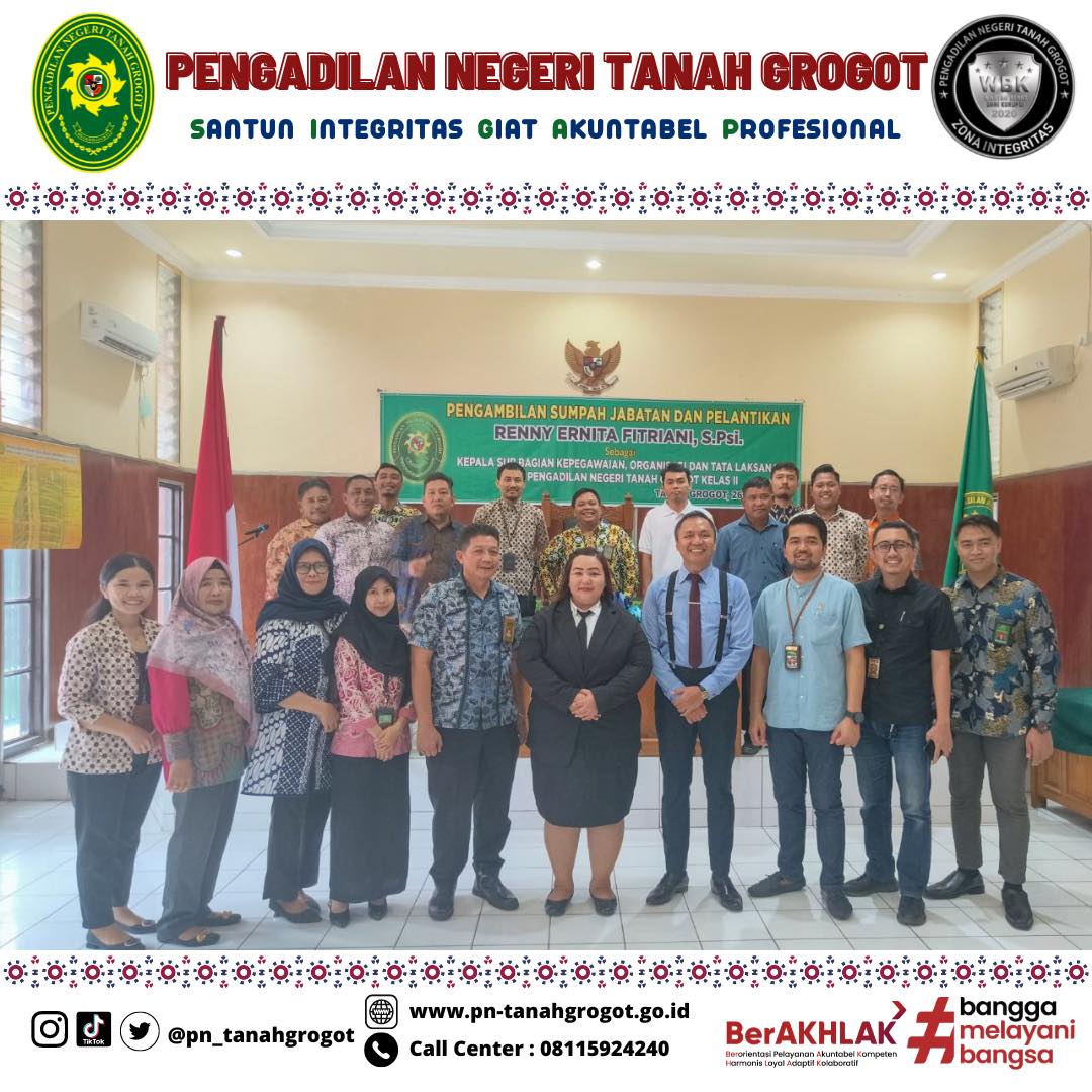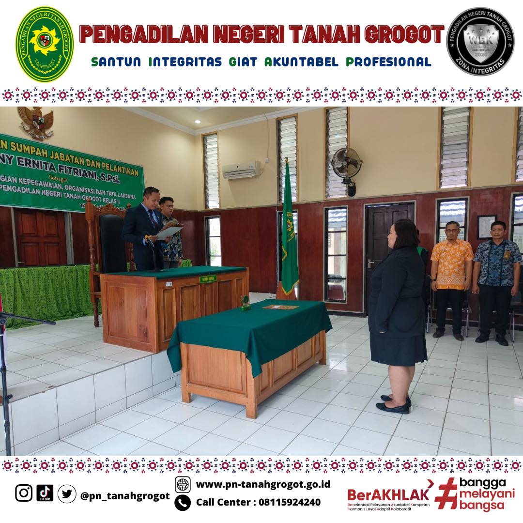 Bertempat di Ruang Sidang Utama Pengadilan Negeri Tanah Grogot, telah berlangsung acara Pelantikan dan Pengambilan Sumpah Kasubbag Kepegawaian dan Ortala, Renny Ernita Fitriani, S.Psi. Acara dimulai dengan proses pengambilan sumpah dan pelantikan pejabat yang bersangkutan dipimpin langsung oleh Ketua Pengadilan Negeri Tanah Grogot, Bapak Made Adicandra Purnawan, S.H. Acara ini dihadiri oleh seluruh pegawai Pengadilan Negeri Tanah Grogot dan pegawai Pengadilan Negeri Samarinda. Turut hadir Bapak Sugianto, S.H. dan Bapak Muhyidin, S.H. sebagai saksi dan Bapak M. Ilham, S.Ag sebagai Rohaniawan. Kemudian acara dilanjutkan dengan pemberian sepatah dua kata dari pejabat yang baru dilantik. Acara kemudian ditutup dengan sesi foto bersama.