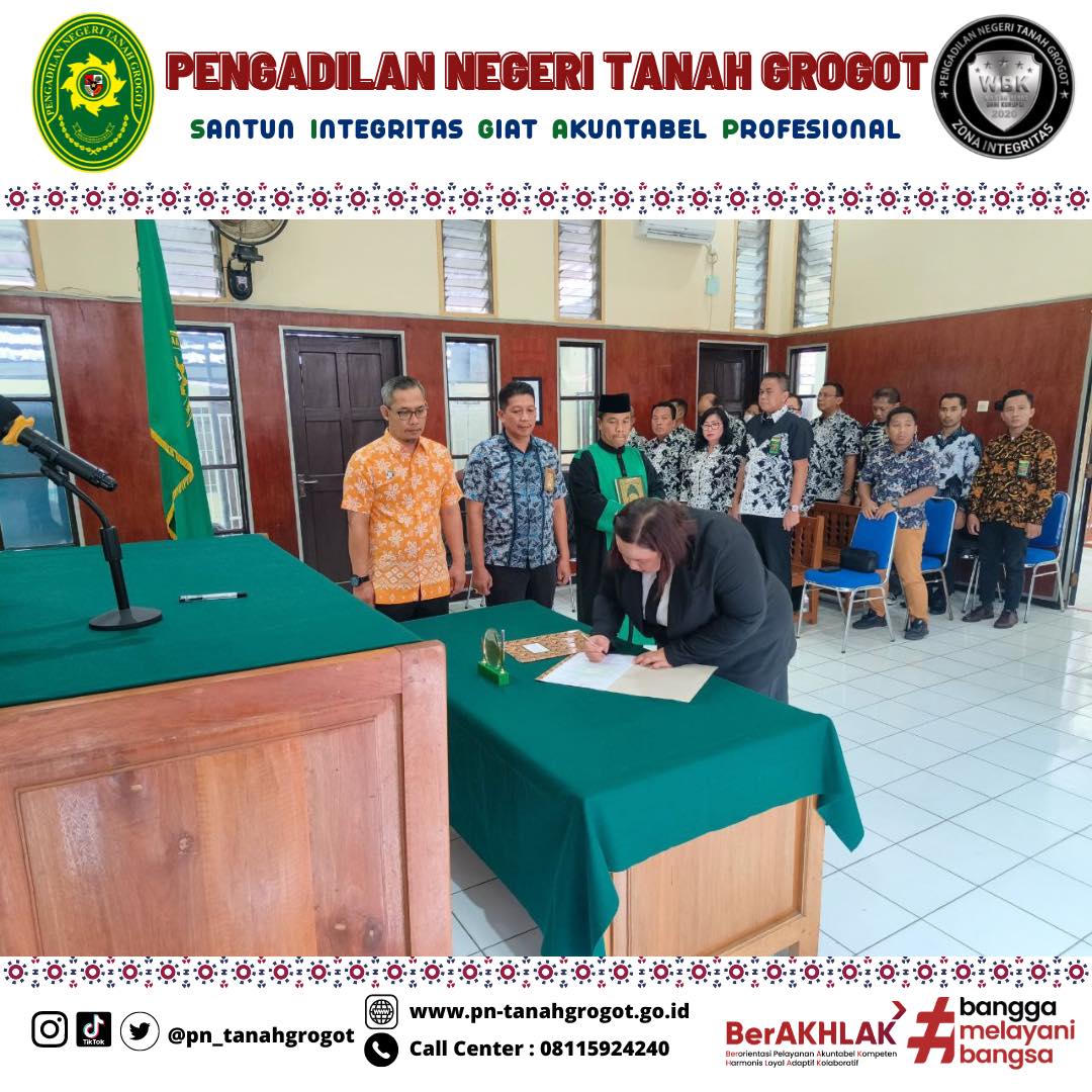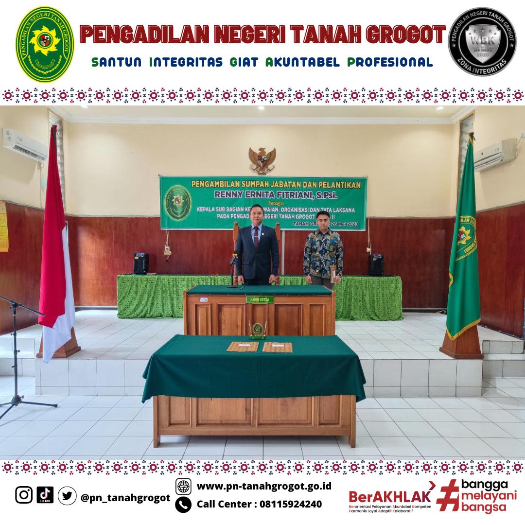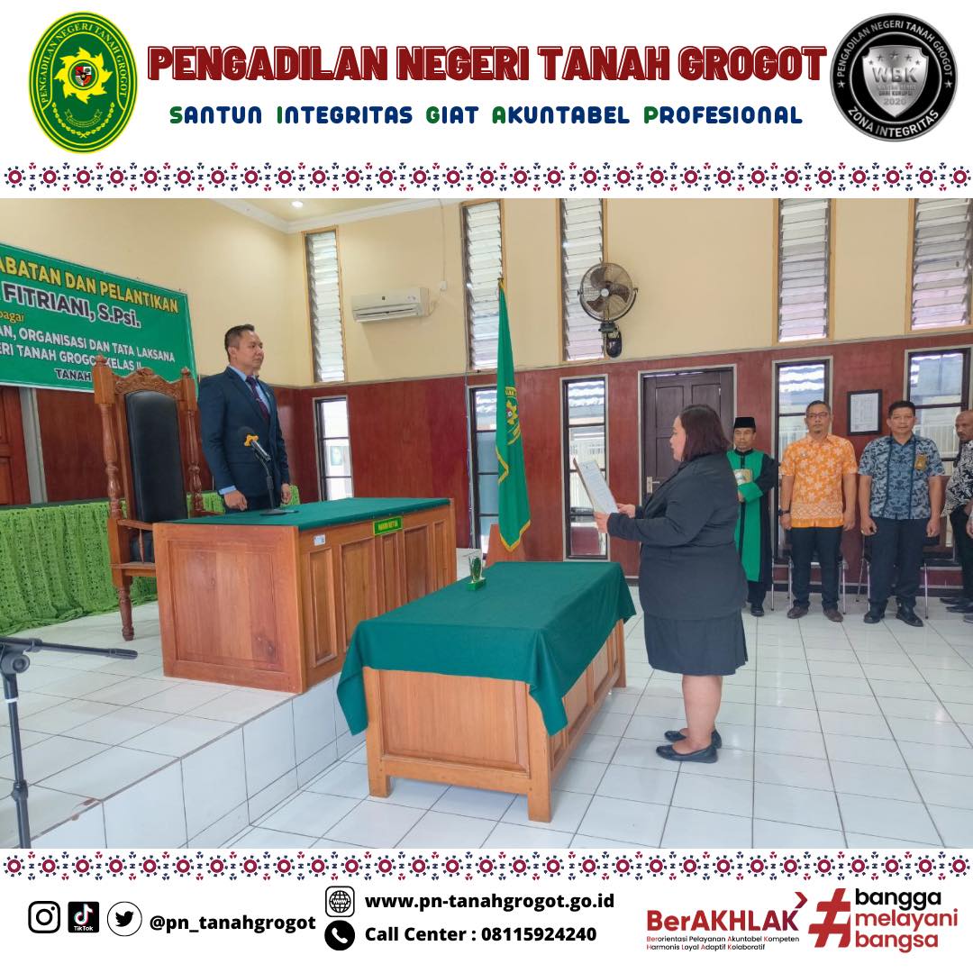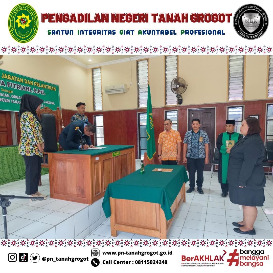 Bertempat di Ruang Sidang Utama Pengadilan Negeri Tanah Grogot, telah berlangsung acara Pelantikan dan Pengambilan Sumpah Kasubbag Kepegawaian dan Ortala, Renny Ernita Fitriani, S.Psi. Acara dimulai dengan proses pengambilan sumpah dan pelantikan pejabat yang bersangkutan dipimpin langsung oleh Ketua Pengadilan Negeri Tanah Grogot, Bapak Made Adicandra Purnawan, S.H. Acara ini dihadiri oleh seluruh pegawai Pengadilan Negeri Tanah Grogot dan pegawai Pengadilan Negeri Samarinda. Turut hadir Bapak Sugianto, S.H. dan Bapak Muhyidin, S.H. sebagai saksi dan Bapak M. Ilham, S.Ag sebagai Rohaniawan. Kemudian acara dilanjutkan dengan pemberian sepatah dua kata dari pejabat yang baru dilantik. Acara kemudian ditutup dengan sesi foto bersama.