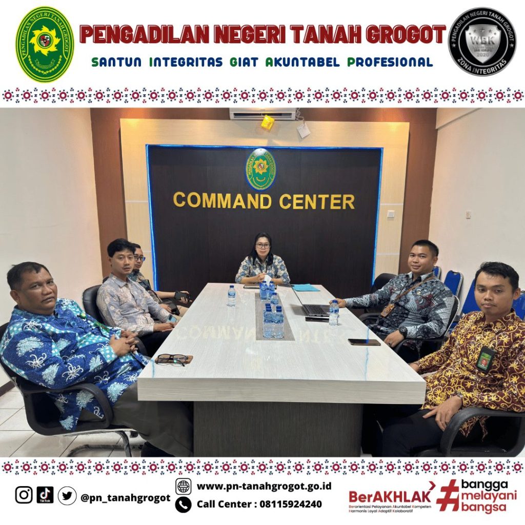 Bertempat di Ruang Command Center Pengadilan Negeri Tanah Grogot, Ketua Pengadilan Negeri Tanah Grogot, Ibu Ari Listyawati, S.H., M.H., Para Hakim, Panitera, dan Sekretaris Pengadilan Negeri Tanah Grogot menghadiri Undangan Pembinaan Bidang Teknis Yudisial Secara Hybrid oleh Pejabat Eselon I Mahkamah Agung RI.