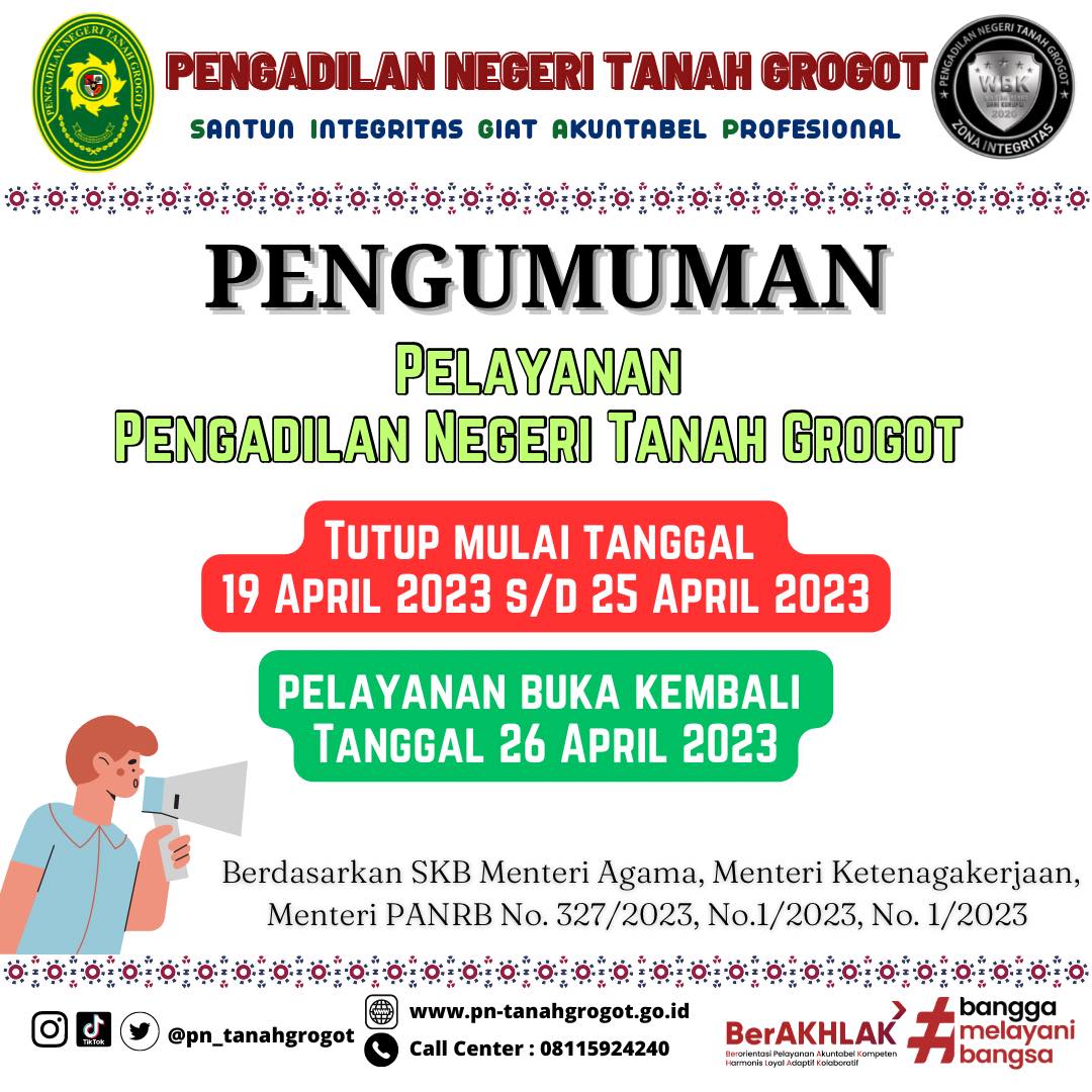 Berdasarkan Surat Keputusan Bersama Menag, Menaker, dan Menpan RB Nomor : 327 Tahun 2023; 1 Tahun 2023; 1 Tahun 2023 tentang Perubahan Hari Libur Nasional dan Cuti Bersama Tahun 2023, maka dengan ini kami informasikan bahwa layanan Pengadilan Negeri Tanah Grogot akan tutup pada tanggal 19 – 25 April 2023 dan layanan akan dibuka kembali pada tanggal 26 April 2023.