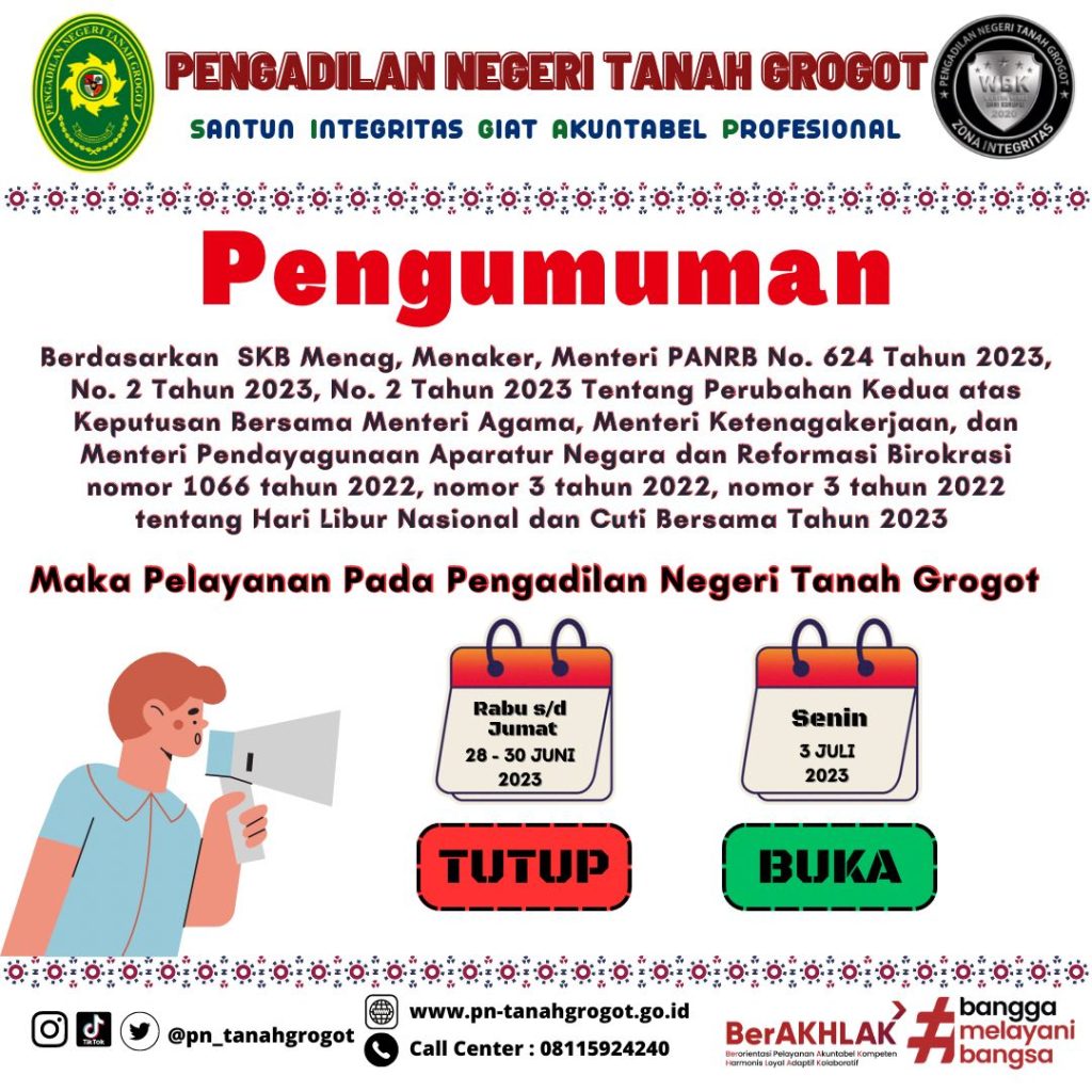 Berdasarkan SKB Menag, Menaker, Menteri PANRB No. 624 Tahun 2023, No. 2 Tahun 2023, No. 2 Tahun 2023 Tentang Perubahan Kedua atas Keputusan Bersama Menteri Agama, Menteri Ketenagakerjaan, dan Menteri Pendayagunaan Aparatur Negara dan Reformasi Birokrasi nomor 1066 tahun 2022, nomor 3 tahun 2022, nomor 3 tahun 2022 tentang Hari Libur Nasional dan Cuti Bersama Tahun 2023, Maka Pelayanan Pengadilan Negeri Tanah Grogot :