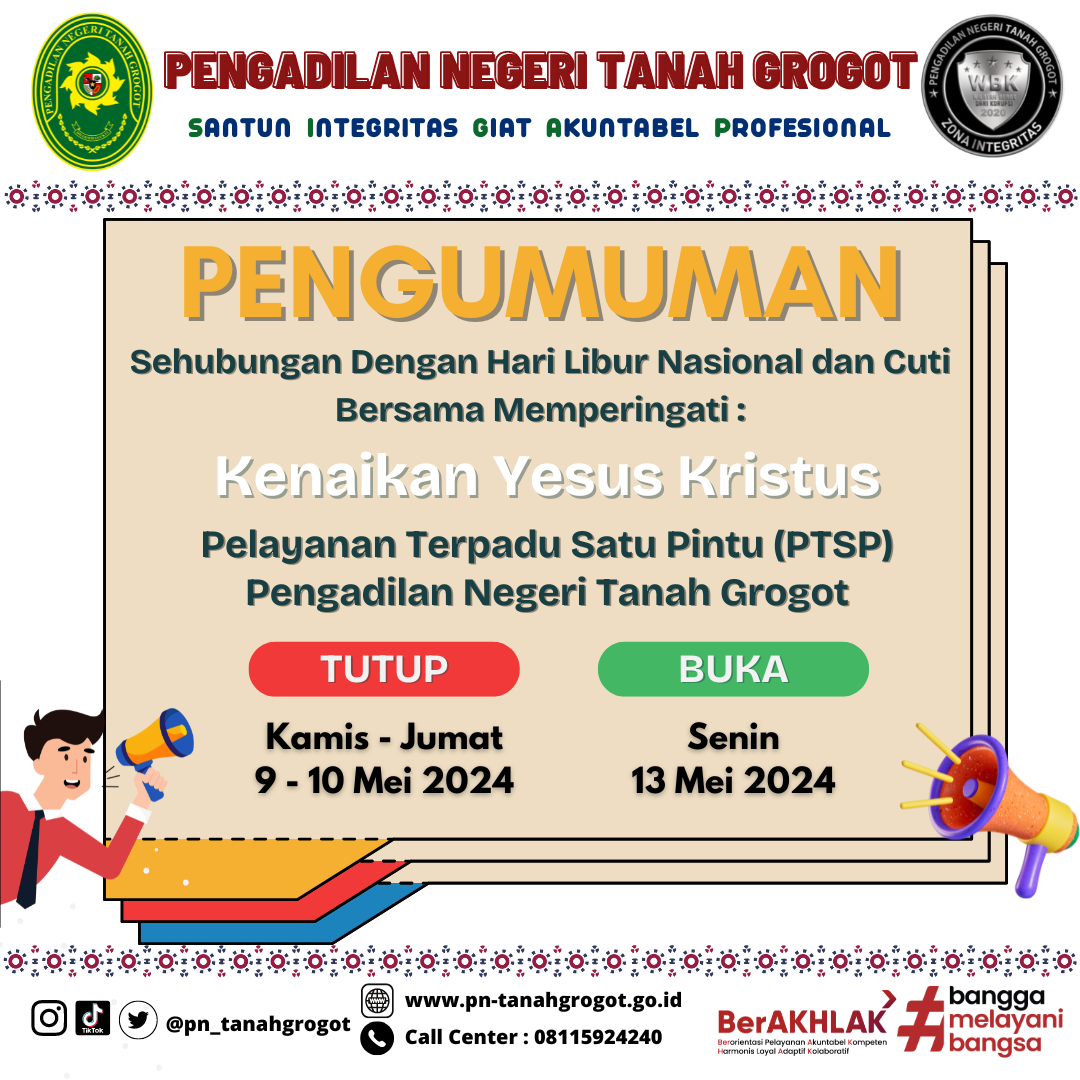 Sehubungan dengan hari libur nasional dan cuti bersama memperingati Kenaikan Yesus Kristus :