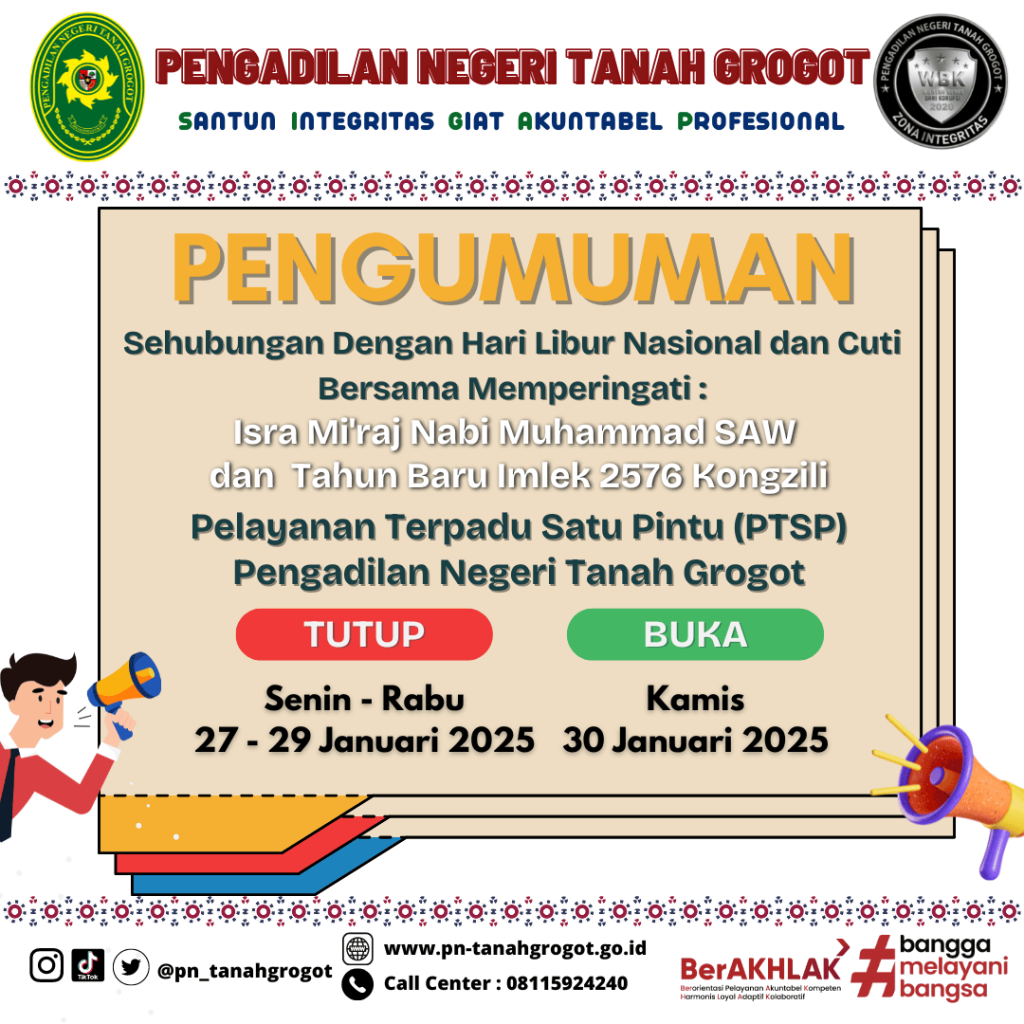 Pengumuman Terkait Pelayanan PTSP Pengadilan Negeri Tanah Grogot Pada Hari Isra Mi’raj dan Tahun Baru Imlek