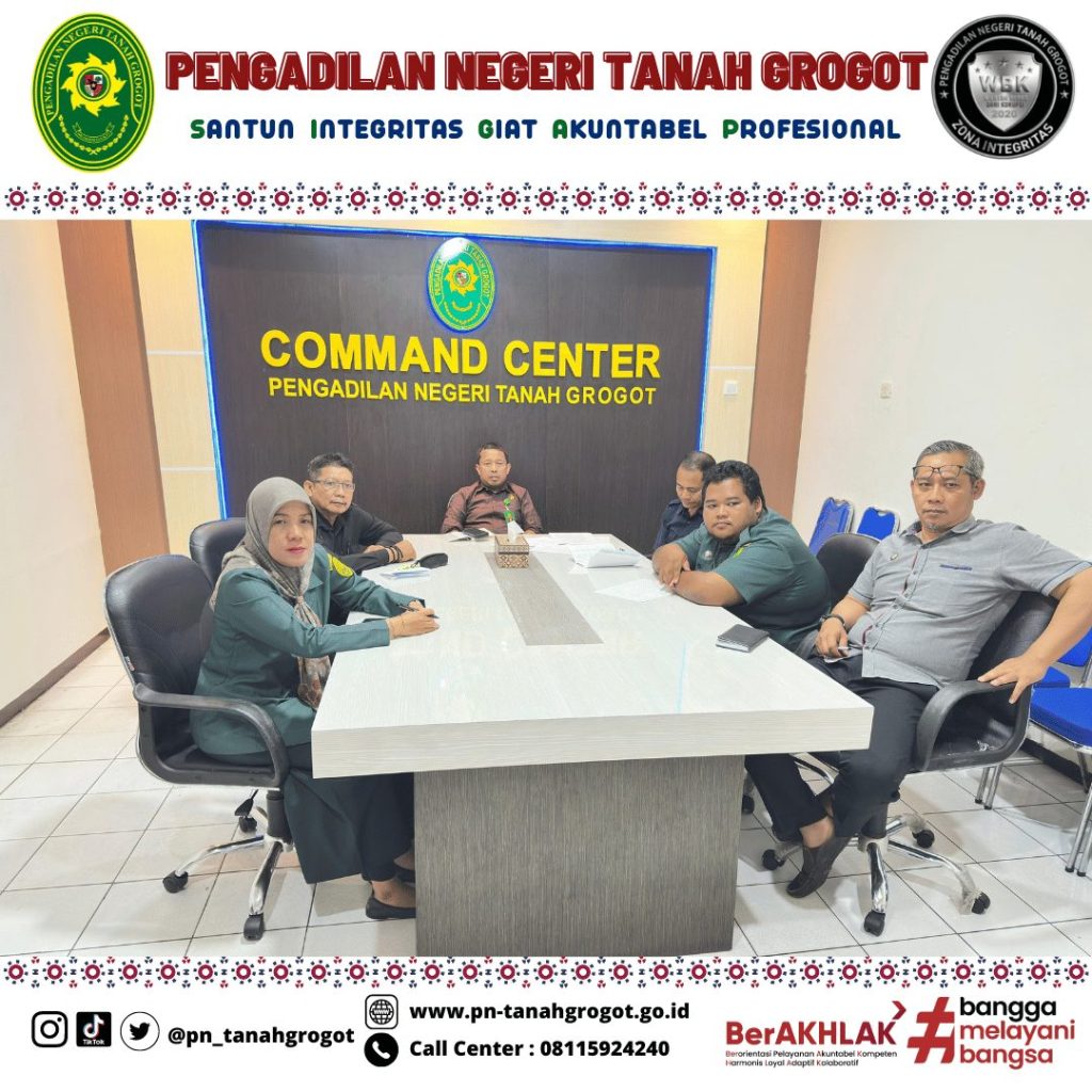 Sehubungan dengan adanya hasil monitoring dan evaluasi terhadap Penginputan Data Layanan Hukum Triwulan I pada Aplikasi Pelaporan Elektronik dan Aplikasi OMSPAN Tahun 2025 yang mana masih ditemukannya perbedaan dalam penginputan data laporan layanan hukum antara Aplikasi Pelaporan Elektronik dengan Aplikasi OMSPAN maka pada hari Selasa tanggal 3 Juni 2025 pukul 10.00 WITA bertempat di Command Center Pengadilan Negeri Tanah Grogot, Wakil Ketua, Plh. Panitera, Sekretaris, Operator OMSPAN dan Operator Pelaporan Elektronik Pengadilan Negeri Tanah Grogot telah mengikuti Rapat Evaluasi Penginputan Data Pelaporan Layanan Hukum Triwulan I Tahun 2025 yang diselenggarakan oleh Direktorat Jenderal Badan Peradilan Umum dan diikuti secara daring melalui aplikasi zoom meeting.