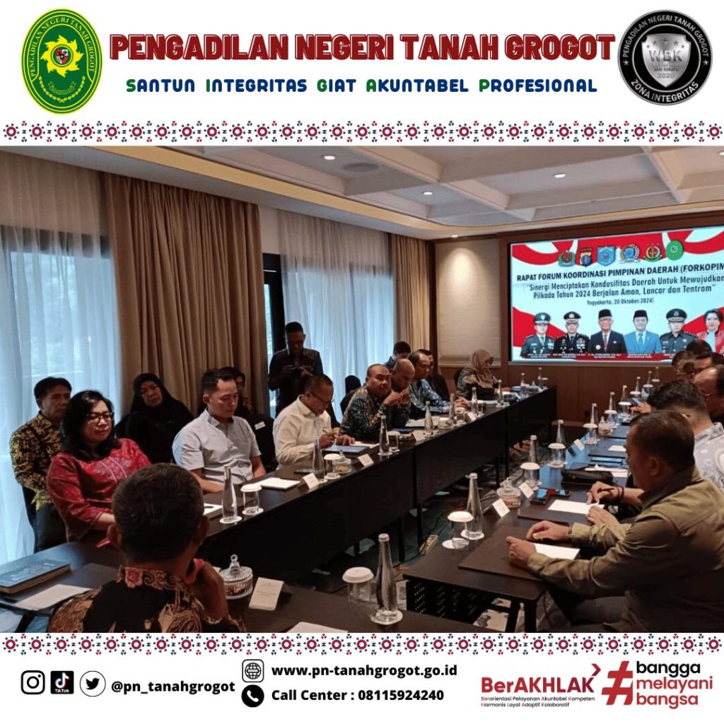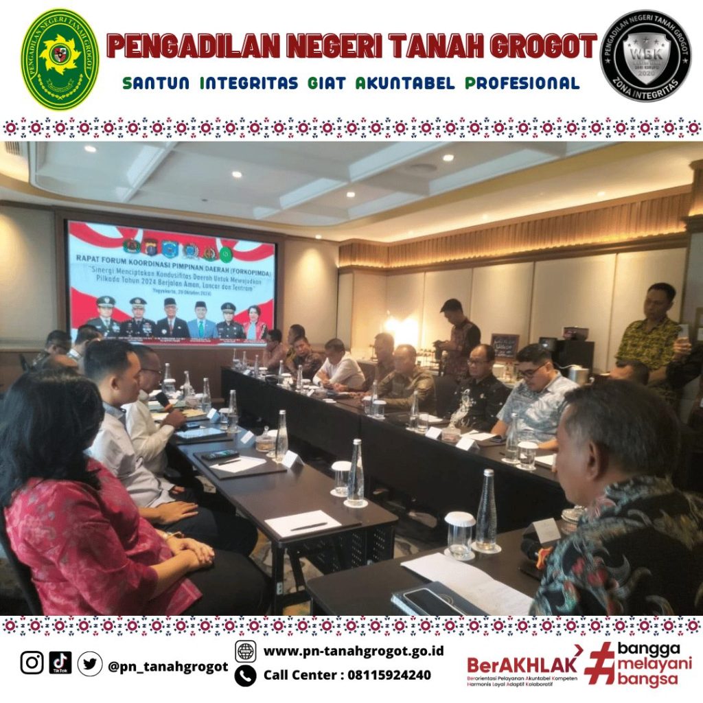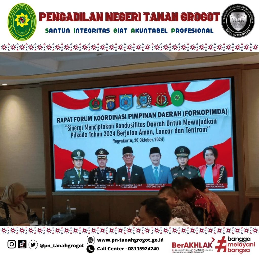 Pada hari Minggu tanggal 20 Oktober 2024 pukul 08.00 WIB bertempat di Hotel Royal Ambarukmo Yogyakarta, Ketua Pengadilan Negeri Tanah Grogot Ibu Ari Listyawati, S.H., M.H. menghadiri Kegiatan Rapat Koordinasi Forum Koordinasi Pimpinan Daerah (FORKOPIMDA) Kabupaten Paser dalam rangka Sinergi Menciptakan Kondusifitas Daerah untuk Mewujudkan Pilkada Tahun 2024 berjalan Aman, Lancar dan Tentram yang diselenggarakan oleh Pemerintah Daerah Kabupaten Paser melalui Badan kesatuan Bangsa dan Politik.