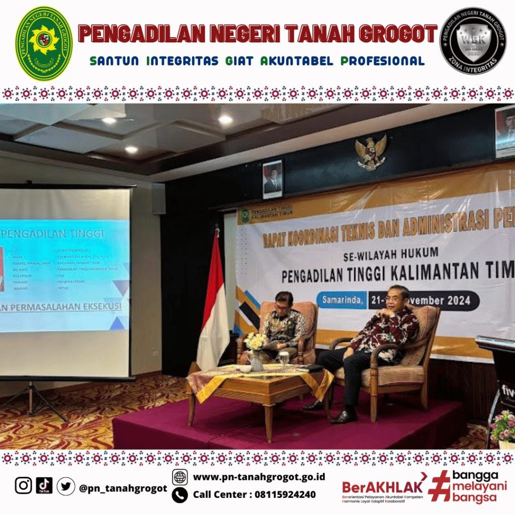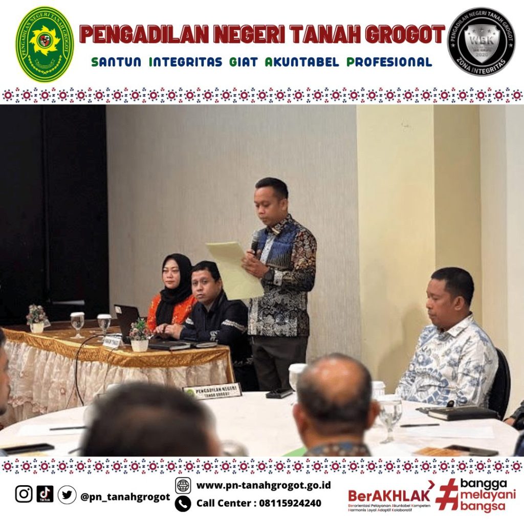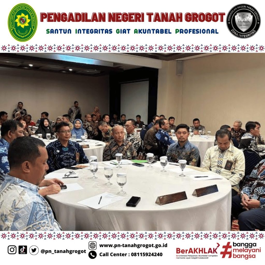 Pada hari Kamis tanggal 21 November 2024 sampai dengan hari Sabtu tanggal 23 November 2024 bertempat di Ruang Kenohan Hotel Five Premiere Samarinda telah dilaksanakan Rapat Koordinasi Teknis dan Administrasi Peradilan Wilayah Hukum Pengadilan Tinggi Kalimantan Timur yang mana dalam kegiatan tersebut diikuti oleh Ketua Pengadilan Negeri Tanah Grogot Ibu Ari Listyawati, S.H., M.H., Wakil Ketua Pengadilan Negeri Tanah Grogot Bpk. Andi Hardiansyah, S.H., M.Hum., Panitera Pengadilan Negeri Tanah Grogot Bpk. Khalid, S.H. dan Sekretaris Pengadilan Negeri Tanah Grogot Bpk. Sugianto, S.H.