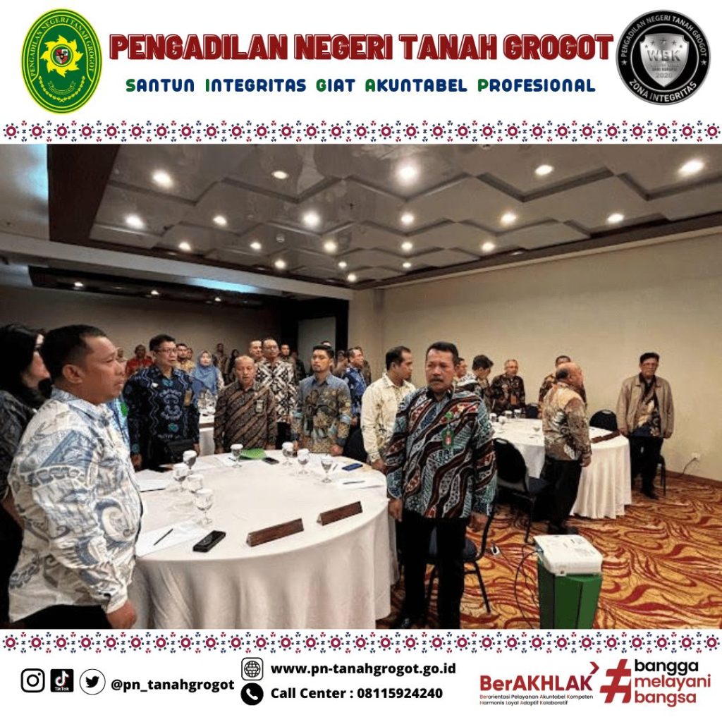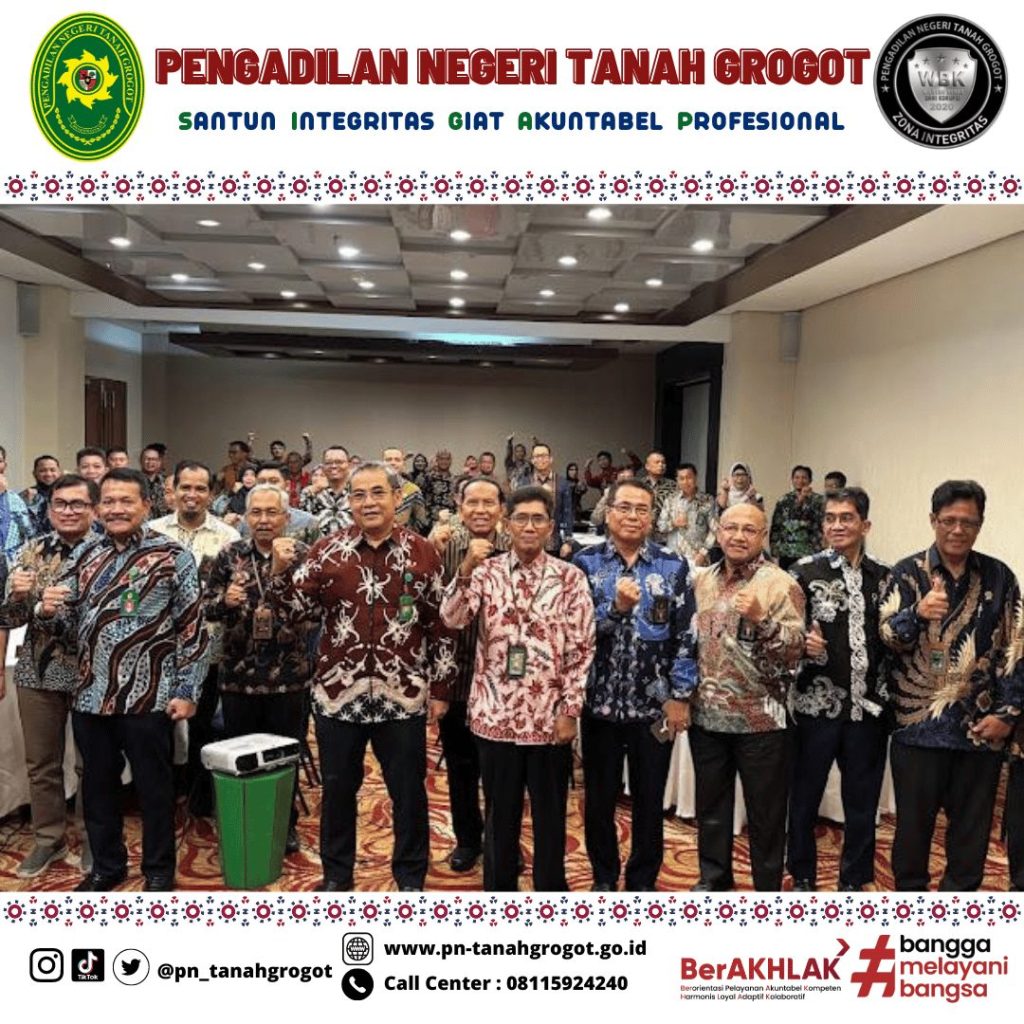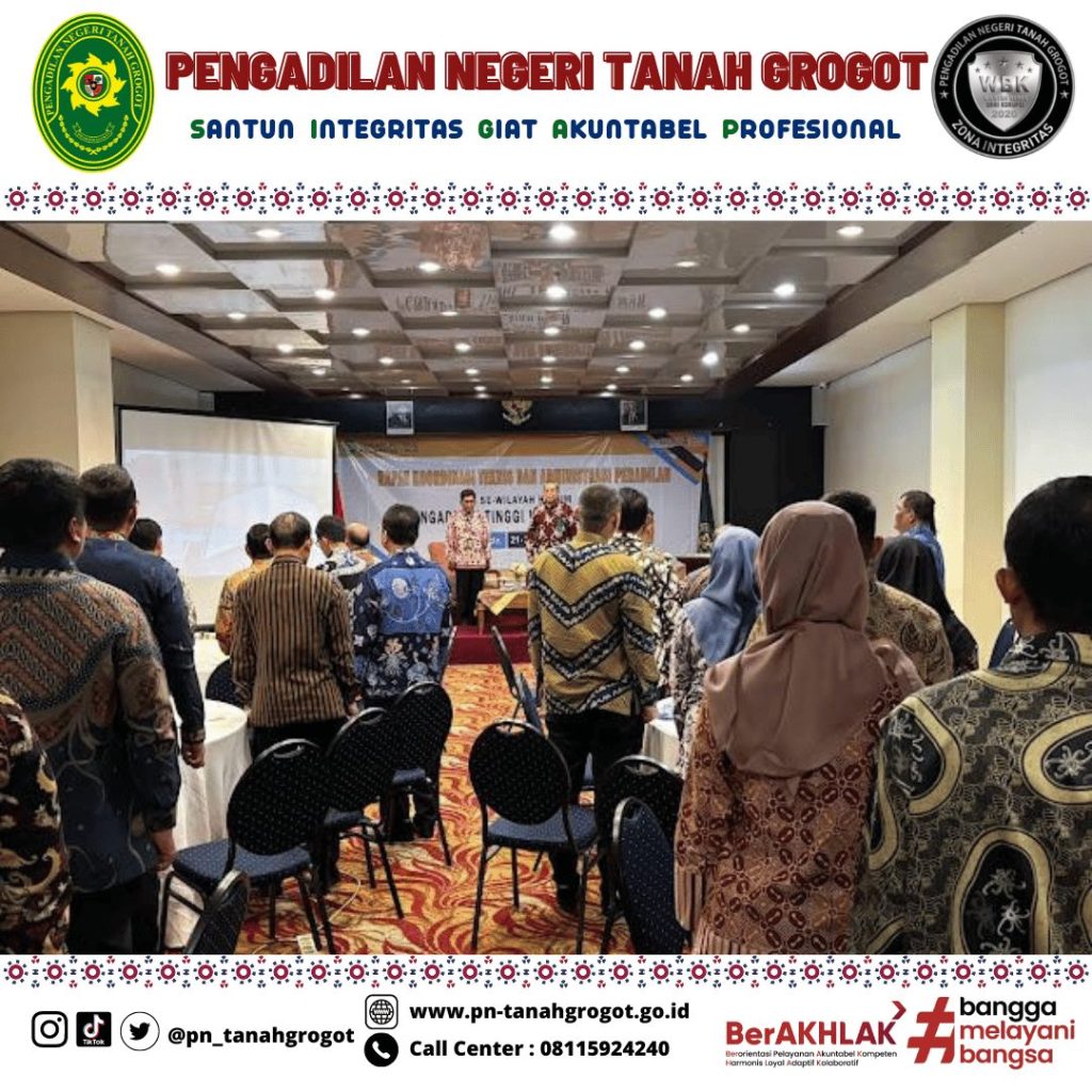 Pada hari Kamis tanggal 21 November 2024 sampai dengan hari Sabtu tanggal 23 November 2024 bertempat di Ruang Kenohan Hotel Five Premiere Samarinda telah dilaksanakan Rapat Koordinasi Teknis dan Administrasi Peradilan Wilayah Hukum Pengadilan Tinggi Kalimantan Timur yang mana dalam kegiatan tersebut diikuti oleh Ketua Pengadilan Negeri Tanah Grogot Ibu Ari Listyawati, S.H., M.H., Wakil Ketua Pengadilan Negeri Tanah Grogot Bpk. Andi Hardiansyah, S.H., M.Hum., Panitera Pengadilan Negeri Tanah Grogot Bpk. Khalid, S.H. dan Sekretaris Pengadilan Negeri Tanah Grogot Bpk. Sugianto, S.H.