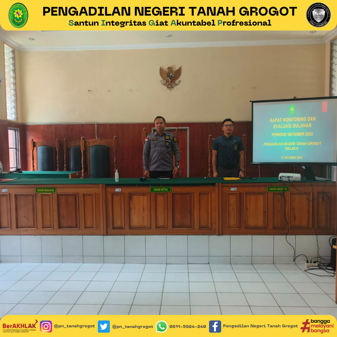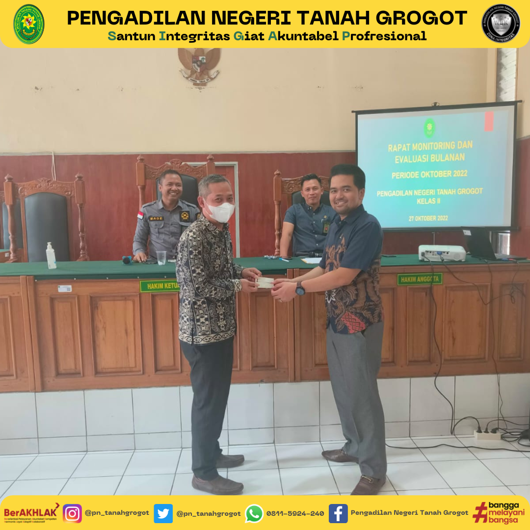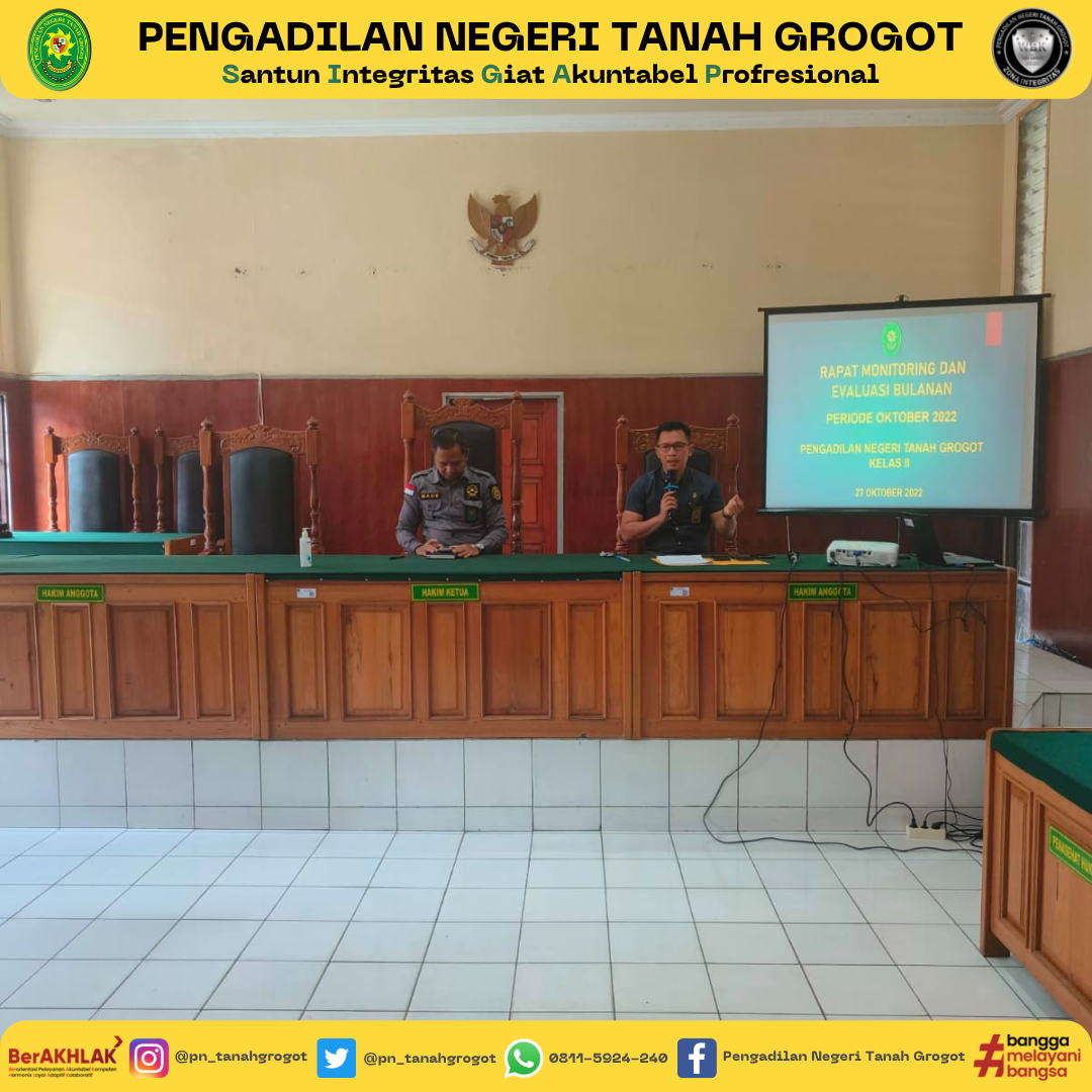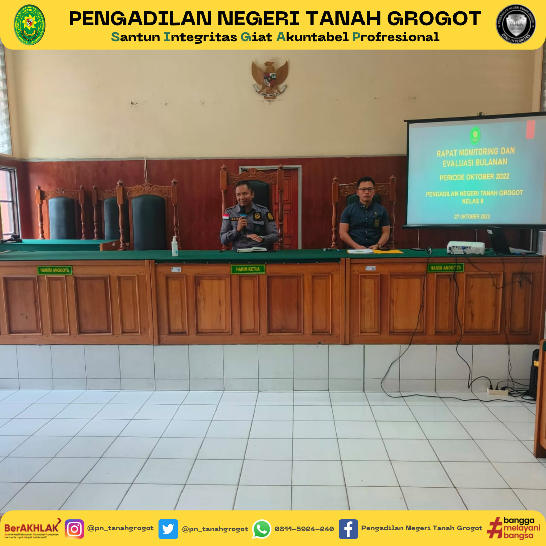 Pada hari ini, dilaksanakan kegiatan Rapat Monitoring dan Evaluasi Bulanan Pengadilan Negeri Tanah Grogot Kelas II. Kegiatan Rapat dipimpin oleh Ketua Pengadilan Negeri Tanah Grogot, Bapak Made Adicandra, S.H.