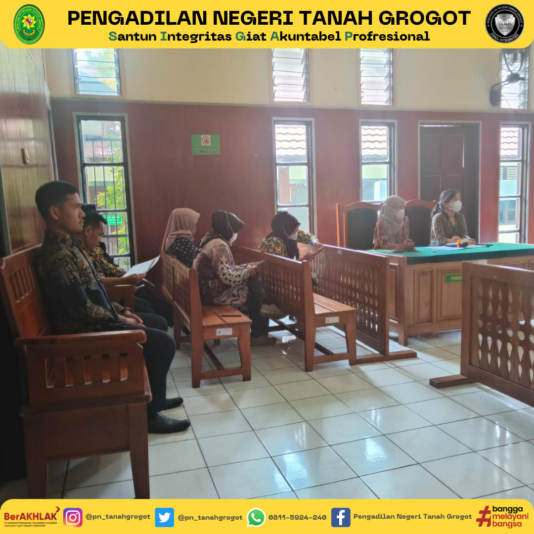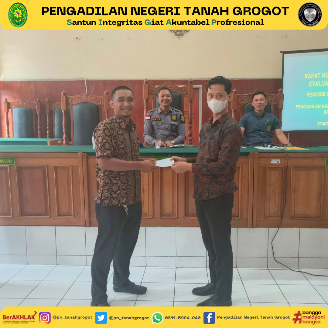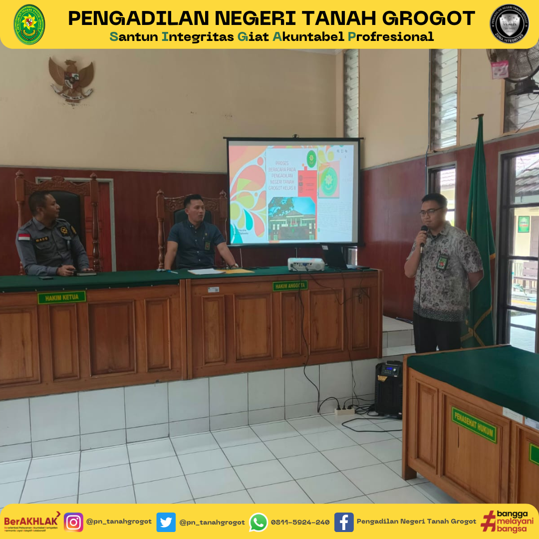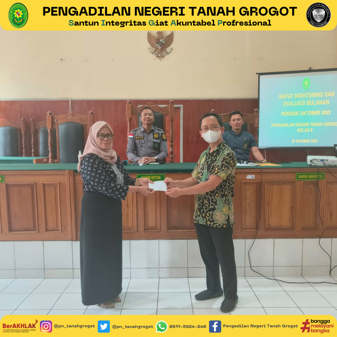 Pada hari ini, dilaksanakan kegiatan Rapat Monitoring dan Evaluasi Bulanan Pengadilan Negeri Tanah Grogot Kelas II. Kegiatan Rapat dipimpin oleh Ketua Pengadilan Negeri Tanah Grogot, Bapak Made Adicandra, S.H.