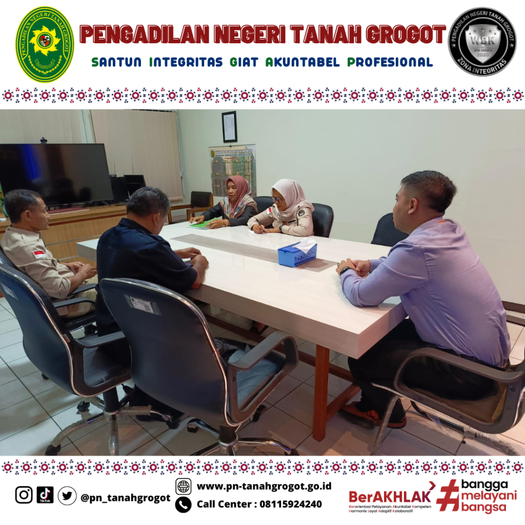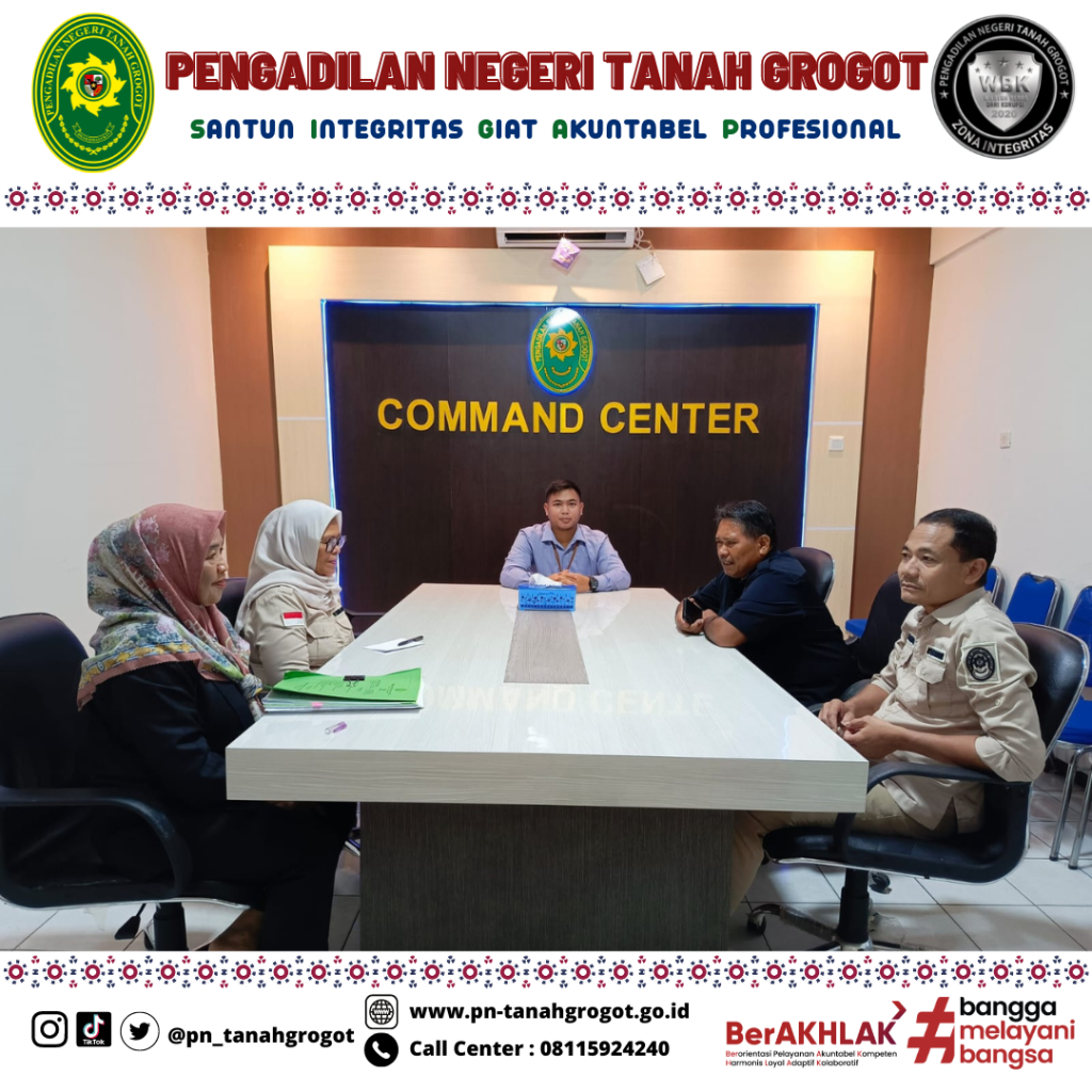 Bertempat di Ruang Command Center Pengadilan Negeri Tanah Grogot telah dilaksanakan Rapat Monitoring dan Evaluasi Implementasi SIPP pada Pengadilan Negeri Tanah Grogot. Rapat ini dipimpin oleh Hakim Pengadilan Negeri Tanah Grogot, Bapak Brillian Hadi Wahyu Pratama, S.H., M.H dan dihadiri oleh Panitera Muda Perdata Pengadilan Negeri Tanah Grogot, Bapak Sunar Baskoro, S.H., Panitera Muda Pidana Pengadilan Negeri Tanah Grogot, Bapak Jekson Sagala, S.H., Panitera Muda Hukum Pengadilan Negeri Tanah Grogot, Ibu Talhah, S.H., dan Panitera Pengganti Pengadilan Negeri Tanah Grogot, Ibu Siti Hajar, S.H. Rapat ini bertujuan untuk memonitoring kedisiplinan penginputan data perkara pada aplikasi Sistem Informasi Penelusuran Perkara (SIPP) Pengadilan Negeri Tanah Grogot.