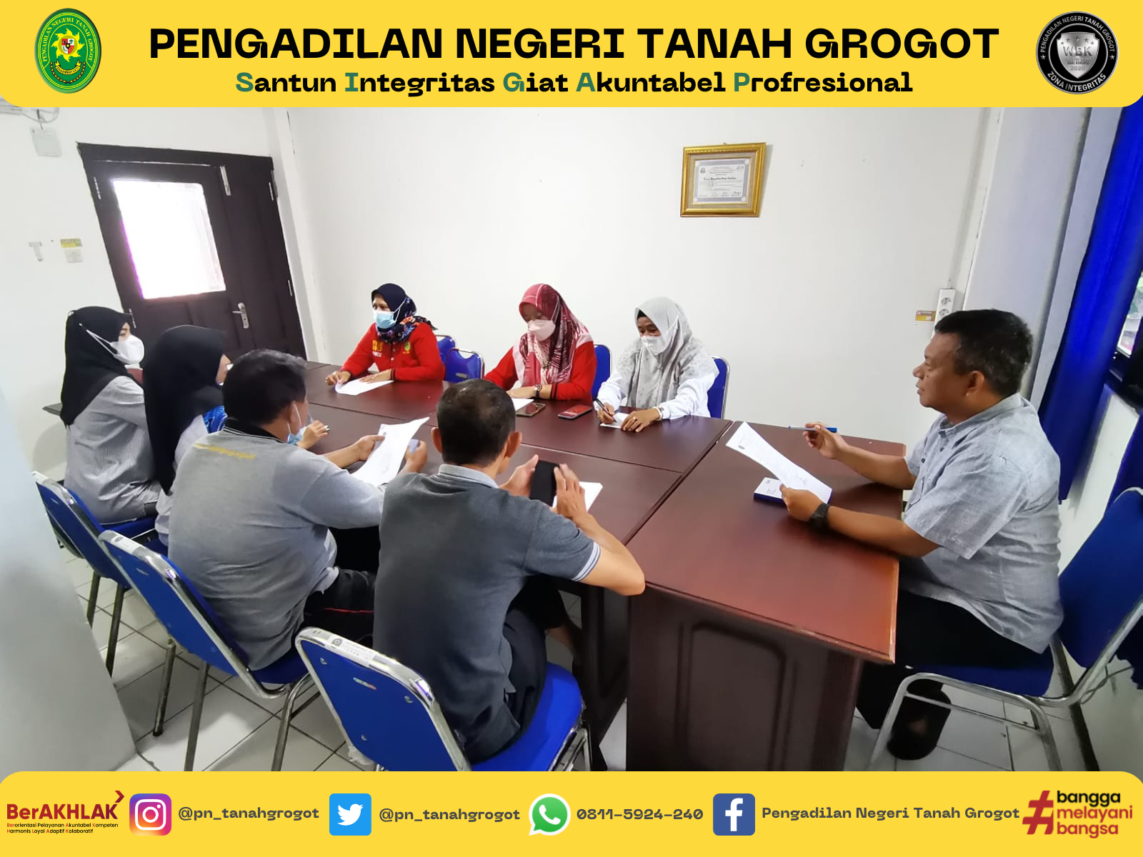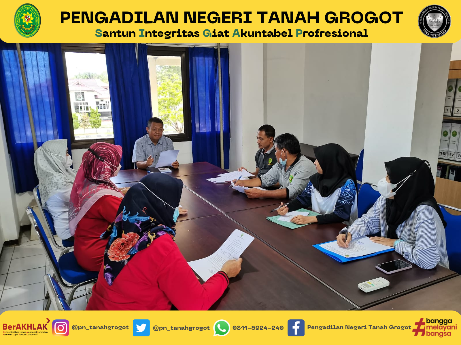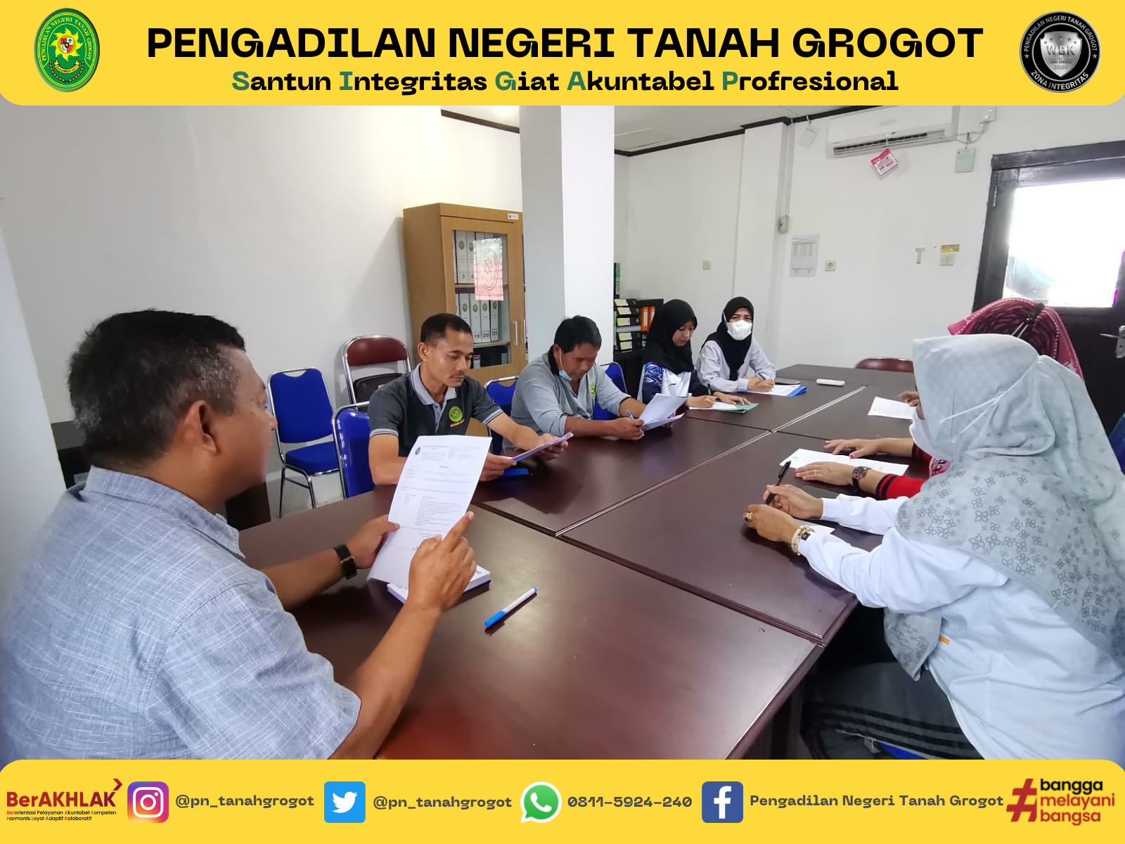 Panitera Pengadilan Negeri Tanah Grogot, Bpk. Anung Handono S.H., memimpin Rapat Evaluasi Kepaniteraan di Ruang Rapat Pengadilan Negeri Tanah Grogot. Rapat tersebut dihadiri oleh seluruh jajaran kepaniteraan Pengadilan Negeri Tanah Grogot.