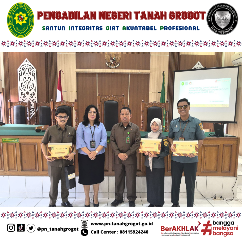 Bertempat di ruang Sidang Utama Pengadilan Negeri Tanah Grogot pada hari Rabu tanggal 29 Oktober 2025 pukul 09.00 WITA Ketua Pengadilan Negeri Tanah Grogot Ibu Ari Listyawati, S.H., M.H. memimpin Rapat Monitoring dan Evaluasi Bulanan Periode September 2025.