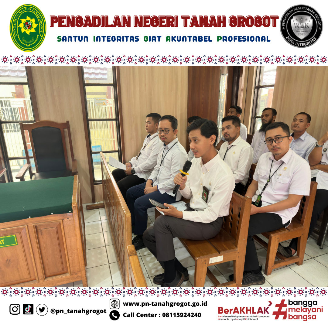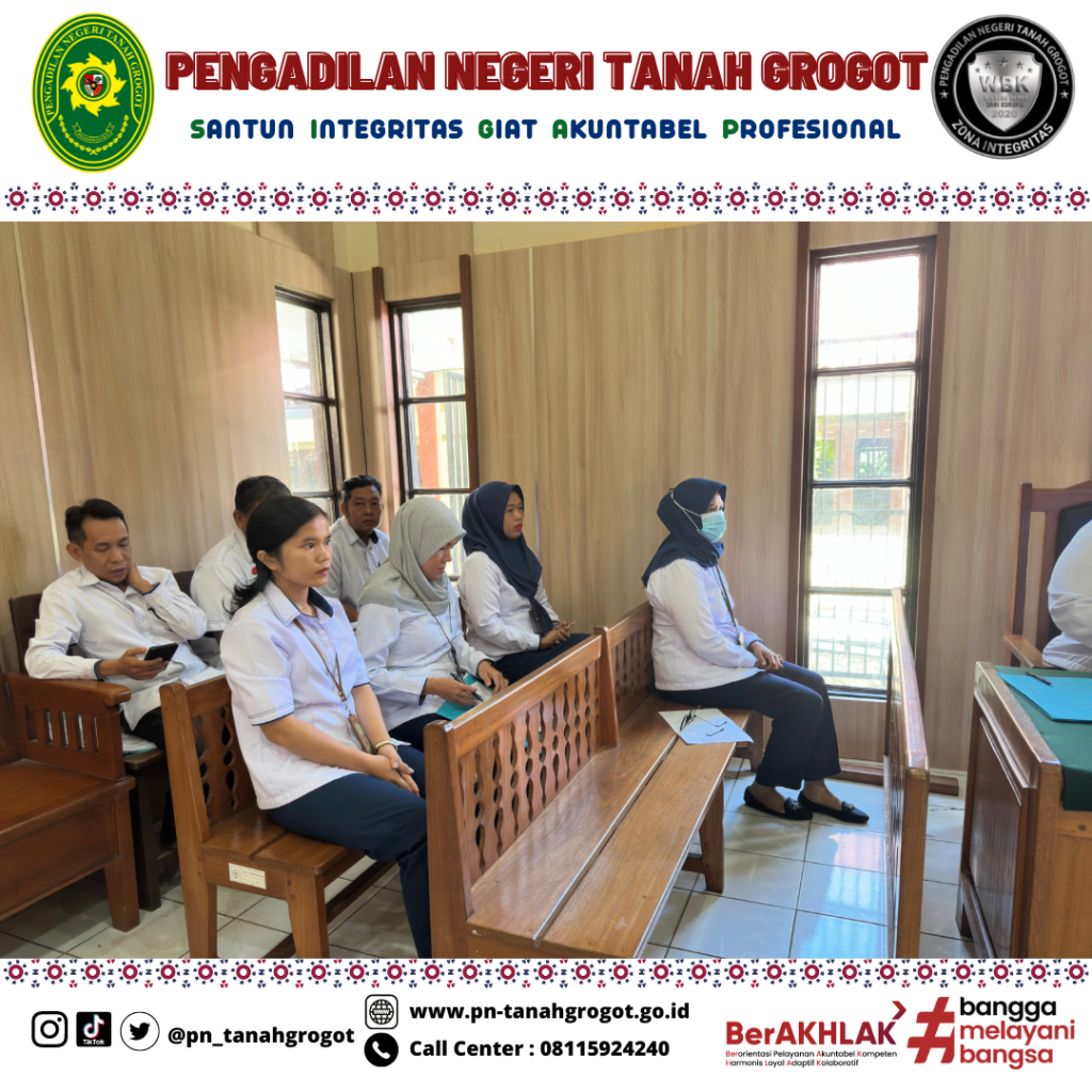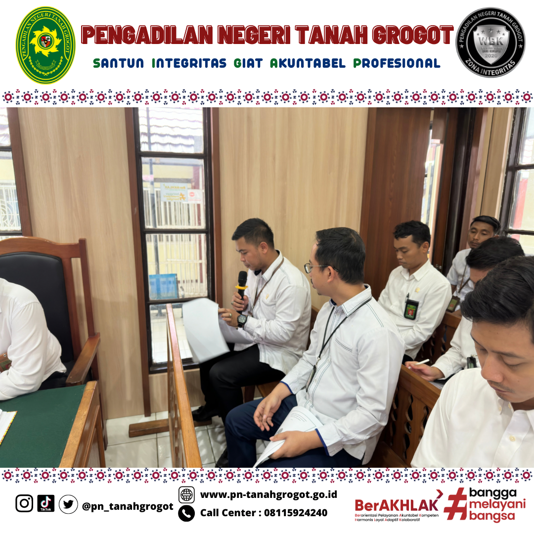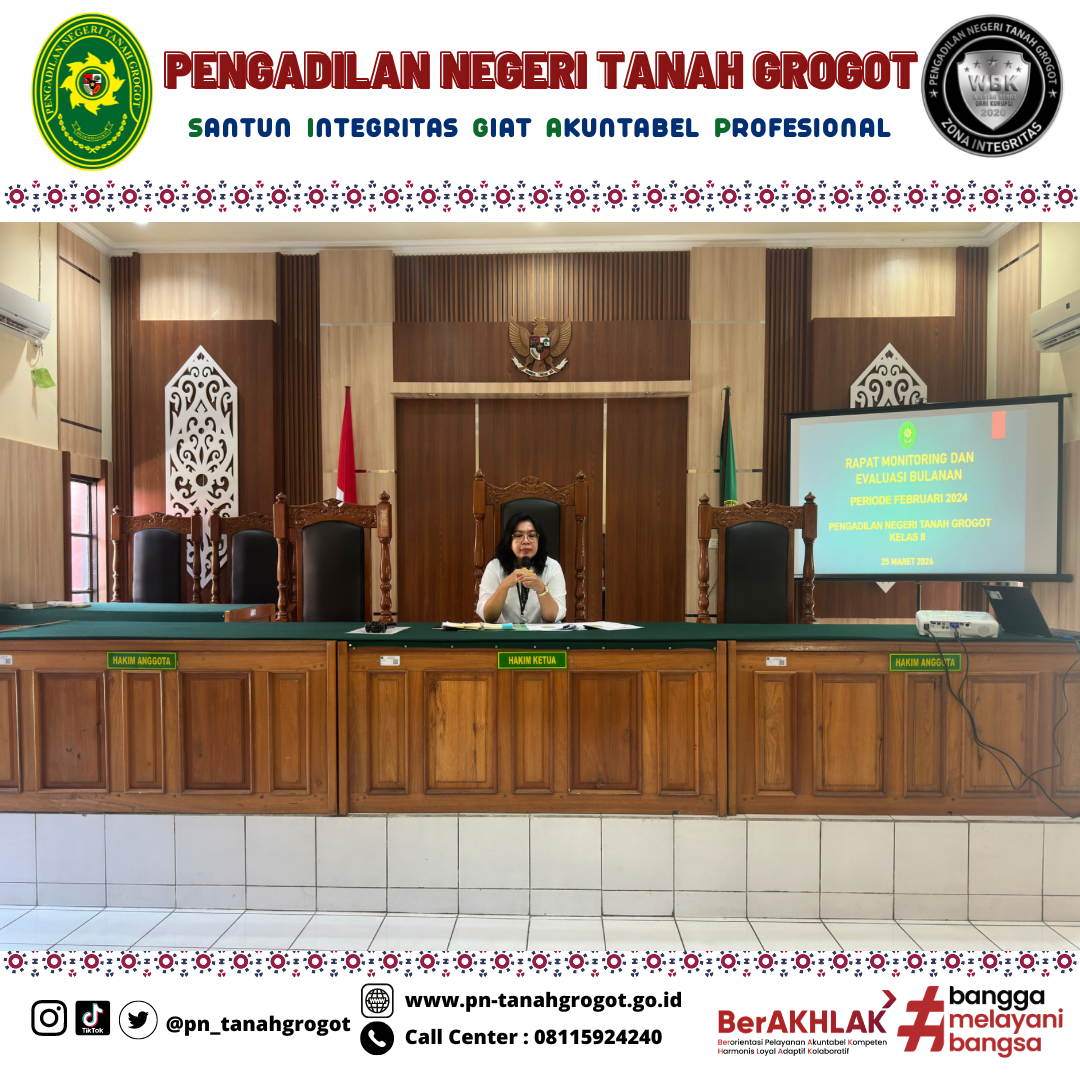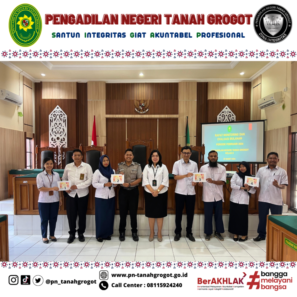 Bertempat di Ruang Sidang Utama Pengadilan Negeri Tanah Grogot telah dilaksanakan Rapat Monitoring dan Evaluasi Periode Februari 2024. Kegiatan ini merupakan forum yang penting untuk membahas berbagai temuan dan tindak lanjut yang diperlukan untuk meningkatkan kualitas pelayanan hukum kepada masyarakat. Rapat dibuka oleh Ketua Pengadilan Negeri Tanah Grogot, Ibu Ari Listyawati, S.H., M.H. Dalam rapat ini membahas berbagai temuan dari Kepaniteraan Pidana, Kepaniteraan Perdata, Kepaniteraan Hukum, Sub Bagian Umum dan Keuangan, Sub Bagian Kepegawaian dan Ortala, dan Sub Bagian Perencanaan, Teknologi Informasi dan Pelaporan. Kemudian rapat dilanjutkan oleh tanggapan dari masing – masing bagian kepaniteraan dan kesekretariatan. Kemudian kegiatan dilanjutkan dengan pemberian arah oleh Ketua Pengadilan Negeri Tanah Grogot. Kegiatan berlanjut ke acara penyerahan hadiah kepada para pemenang Lomba Tenis Meja Pengadilan Negeri Tanah Grogot.