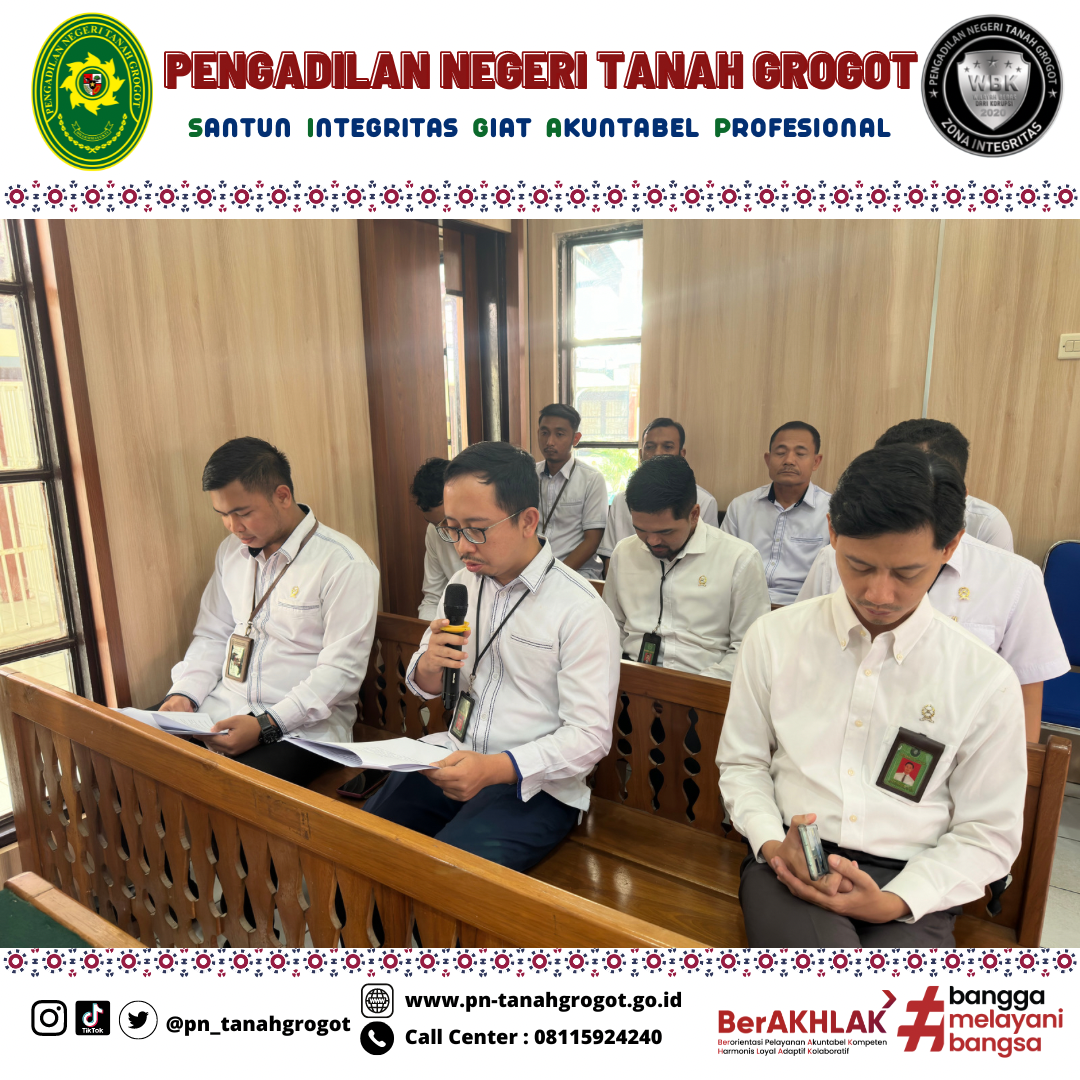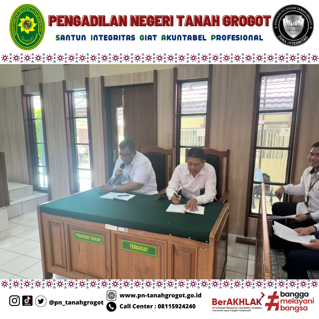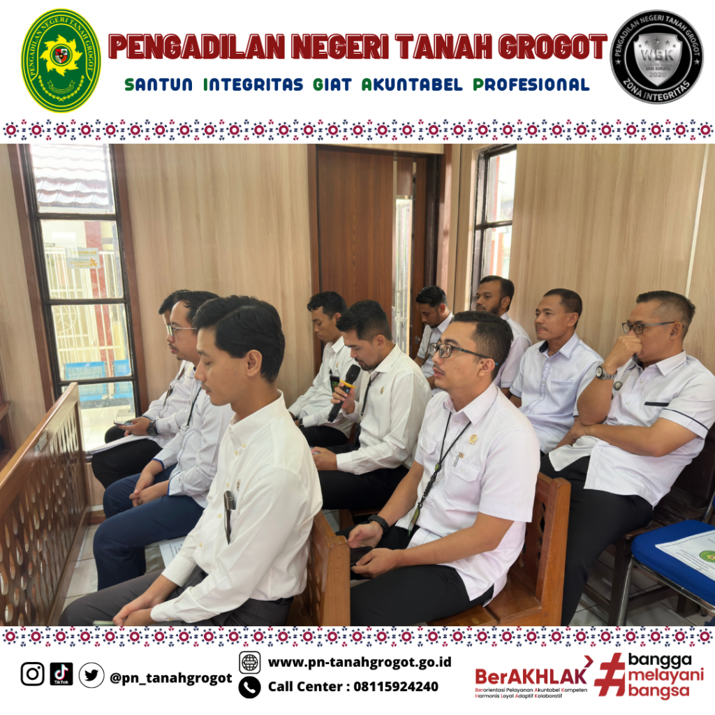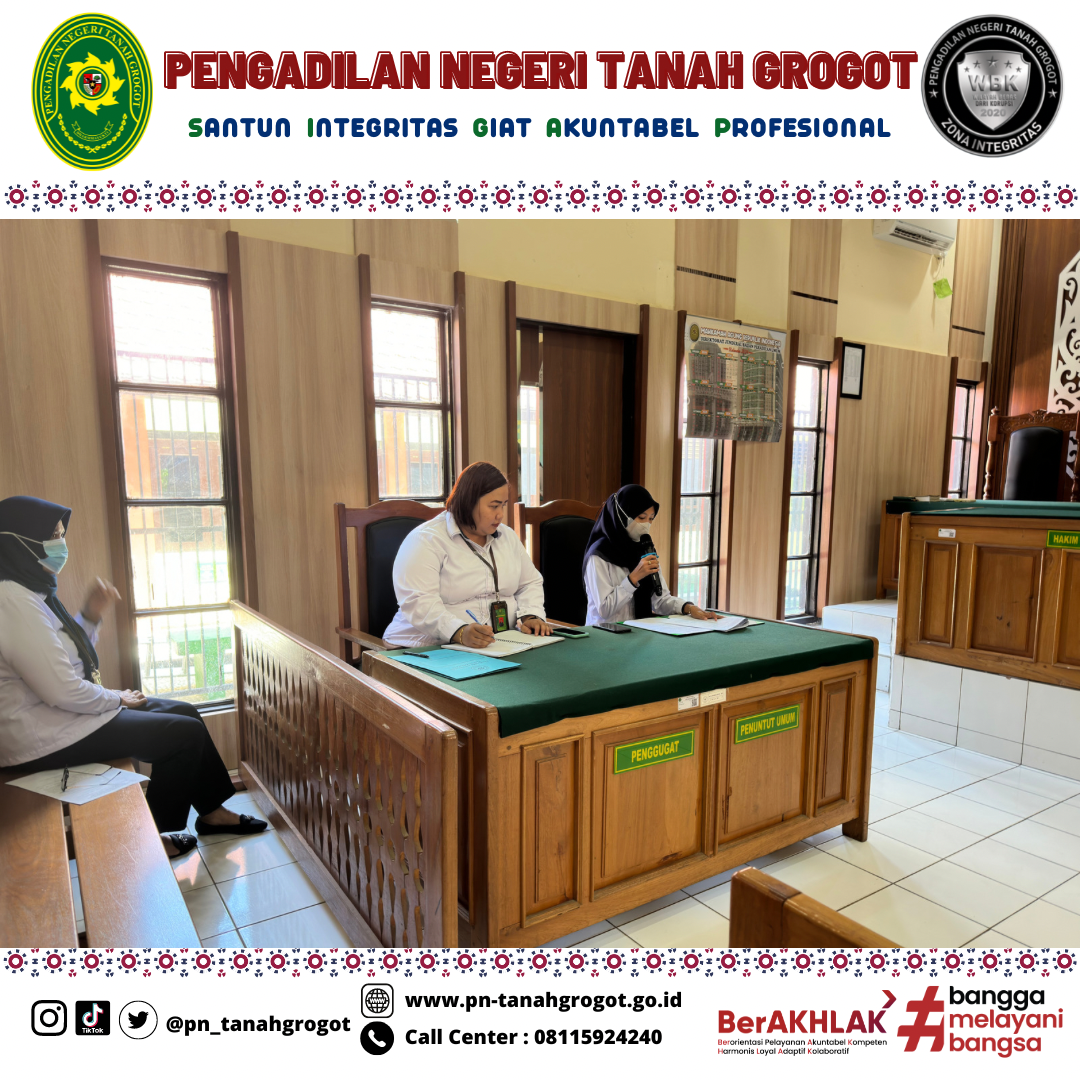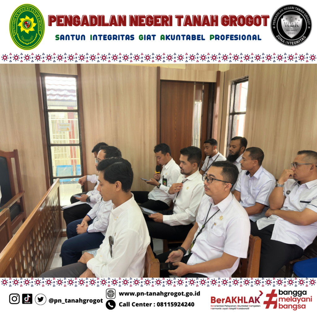 Bertempat di Ruang Sidang Utama Pengadilan Negeri Tanah Grogot telah dilaksanakan Rapat Monitoring dan Evaluasi Periode Februari 2024. Kegiatan ini merupakan forum yang penting untuk membahas berbagai temuan dan tindak lanjut yang diperlukan untuk meningkatkan kualitas pelayanan hukum kepada masyarakat. Rapat dibuka oleh Ketua Pengadilan Negeri Tanah Grogot, Ibu Ari Listyawati, S.H., M.H. Dalam rapat ini membahas berbagai temuan dari Kepaniteraan Pidana, Kepaniteraan Perdata, Kepaniteraan Hukum, Sub Bagian Umum dan Keuangan, Sub Bagian Kepegawaian dan Ortala, dan Sub Bagian Perencanaan, Teknologi Informasi dan Pelaporan. Kemudian rapat dilanjutkan oleh tanggapan dari masing – masing bagian kepaniteraan dan kesekretariatan. Kemudian kegiatan dilanjutkan dengan pemberian arah oleh Ketua Pengadilan Negeri Tanah Grogot. Kegiatan berlanjut ke acara penyerahan hadiah kepada para pemenang Lomba Tenis Meja Pengadilan Negeri Tanah Grogot.