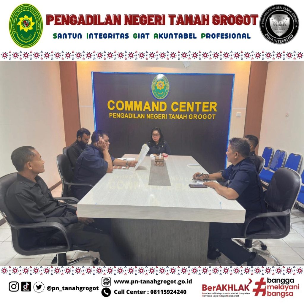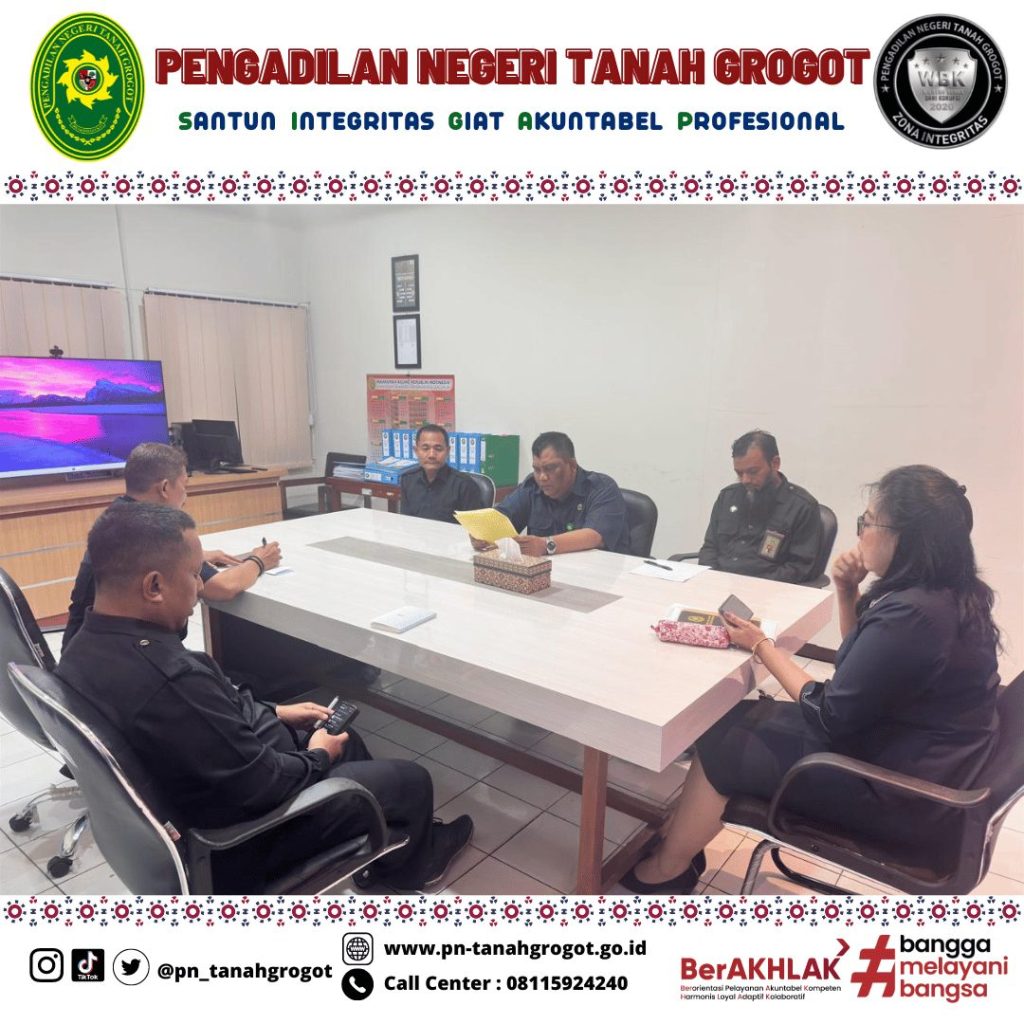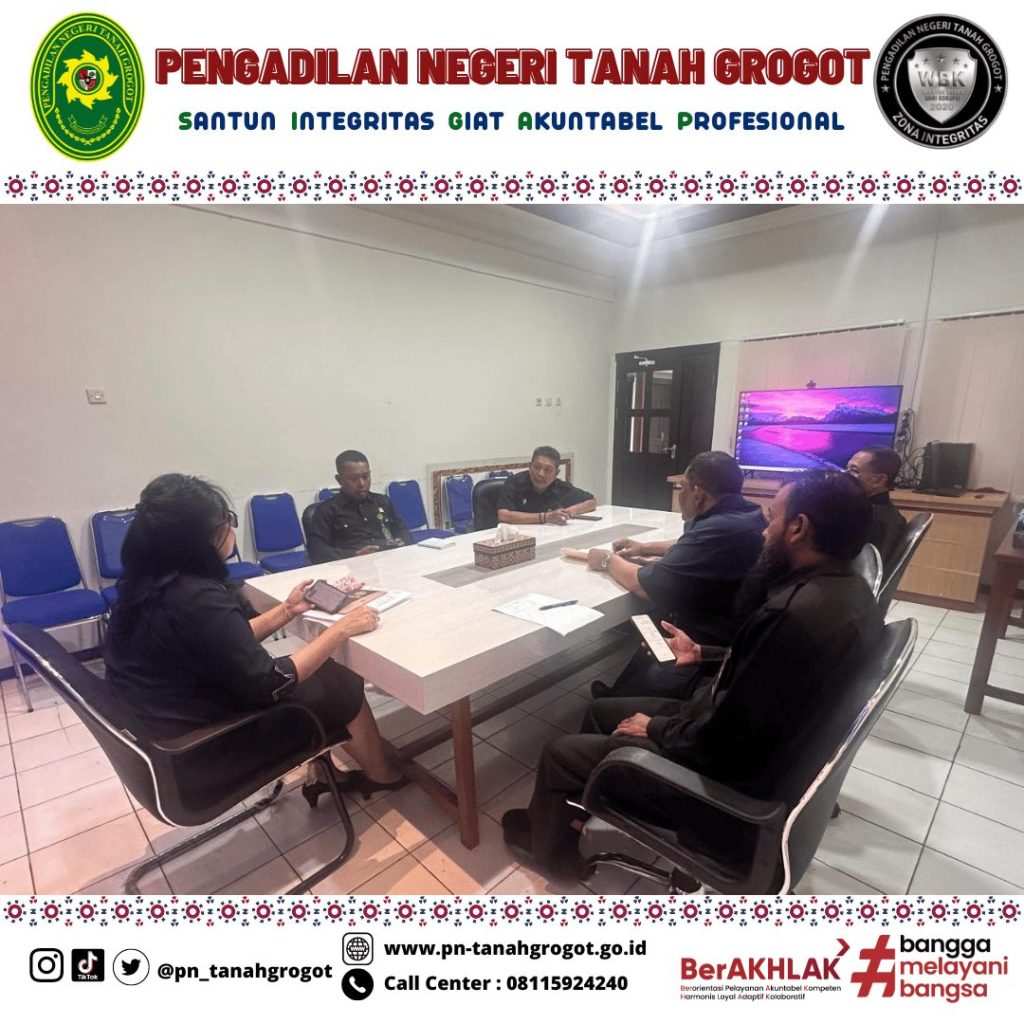 Sehubungan dengan adanya permintaan data rencana kebutuhan layanan hukum untuk tahun anggaran 2026, 2027 dan 2028 oleh Dirjen Badilum maka pada hari Selasa tanggal 21 Januari 2025 Pukul 14.00 WITA di Ruang Command Center Pengadilan Negeri Tanah Grogot, Ketua beserta Wakil Ketua, Panitera, Sekretaris, Panmud Perdata dan Kasubag PTIP mengadakan rapat pengusulan target layanan hukum dengan jenis layanan berupa Posbakum, Prodeo dan Sidang di Luar Gedung Pengadilan.