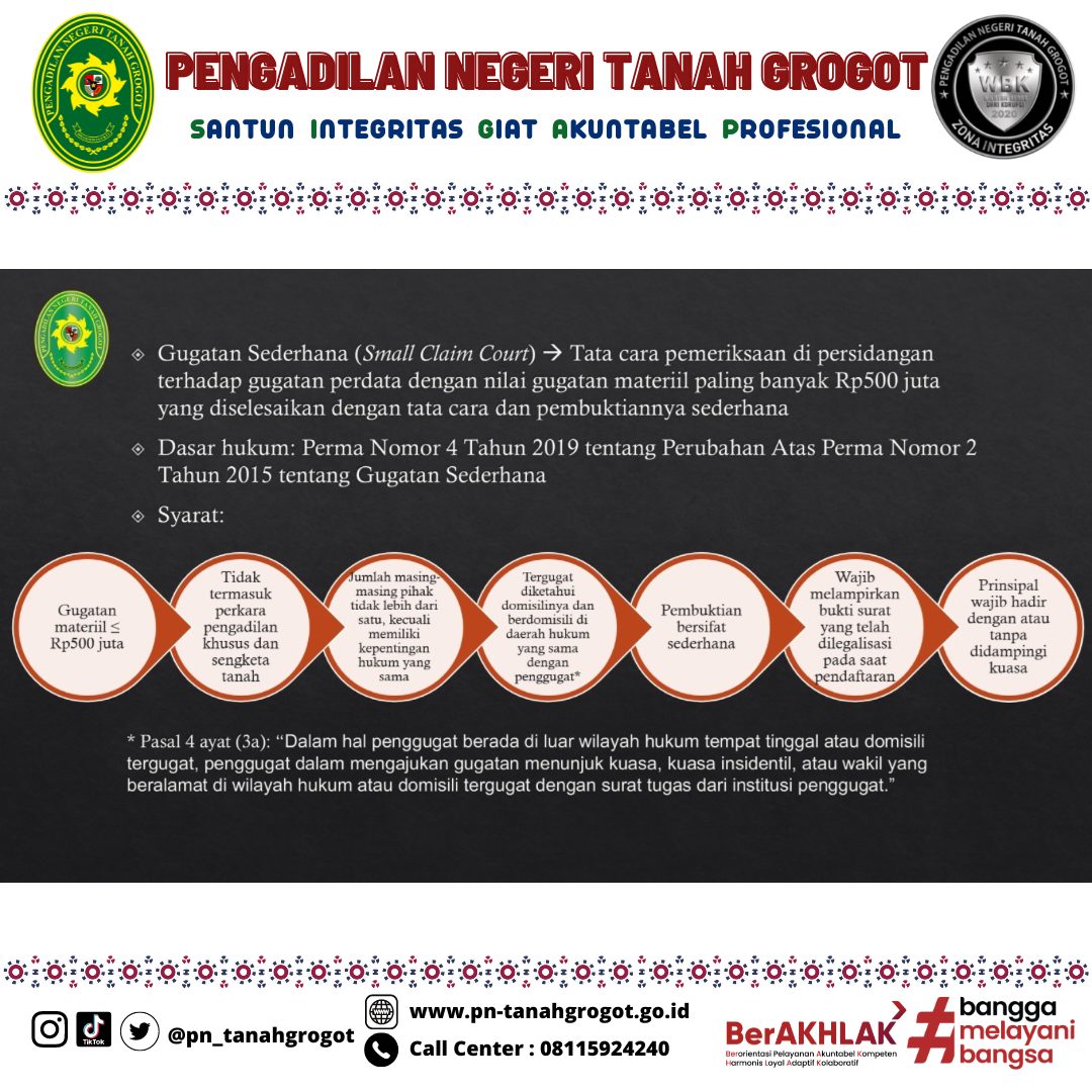 Jumat 21 Juni 2024, Pengadilan Negeri Tanah Grogot melaksanakan sosialisasi di BRI Cabang Tanah Grogot dengan tajuk “Mekanisme Penyelesaian Kredit Bermasalah Melalui Gugatan Sederhana”. Materi sosialisasi meliputi latar belakang diterbitkannya Perma Gugatan Sederhana, syarat dan prosedur beracara, perbedaannya dibandingkan dengan gugatan biasa, serta dilanjutkan diskusi mengenai isu-isu dalam praktik persidangan gugatan sederhana.