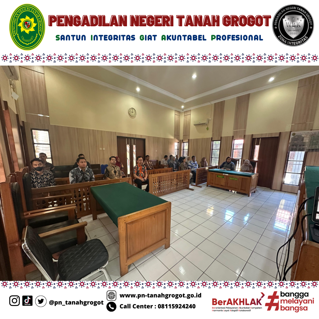 Bertempat di Ruang Sidang Utama Pengadilan Negeri Tanah Grogot pada hari Kamis tanggal 29 Februari 2024 pukul 09.00 WITA Ketua Pengadilan Negeri Tanah Grogot Ibu Ari Listyawati, S.H., M.H. melaksanakan Sosialisasi Nilai-Nilai Utama Badan Peradilan dan Sosialisasi Nilai-Nilai Dasar (Core Value) ASN Ber-AKHLAK yang diikuti oleh para Hakim, Panitera, ASN dan PPNPN Pengadilan Negeri Tanah Grogot.