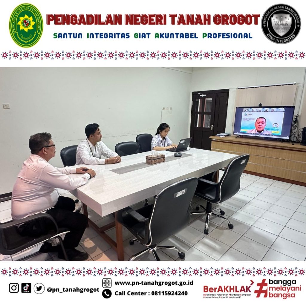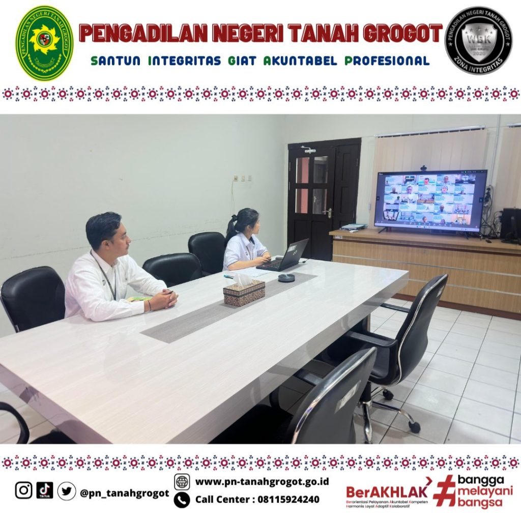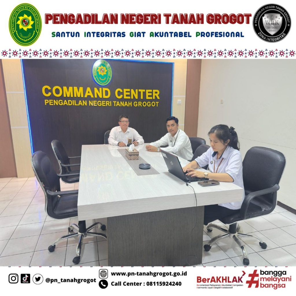Untuk kelancaran Pelaksanaan Pengawasan dan Pengendalian BMN tersebut maka pada hari Senin tanggal 30 Juni 2025 pukul 14.00 WITA bertempat di Command Center Pengadilan Negeri Tanah Grogot Sekretaris Pengadilan Negeri Tanah Grogot Bpk. Sugianto, S.H., Ibu Arjudus Sada Arihta Angkat, S.E. dan Bpk. Muhammad Ilham Yusnin, S.T. mengikuti kegiatan Sosialisasi Pelaksanaan Penyusunan dan Penyampaian Laporan Pengawasan dan Pengendalian Barang Milik Negara Semester I Tahun 2025 secara daring melalui zoom meeting.