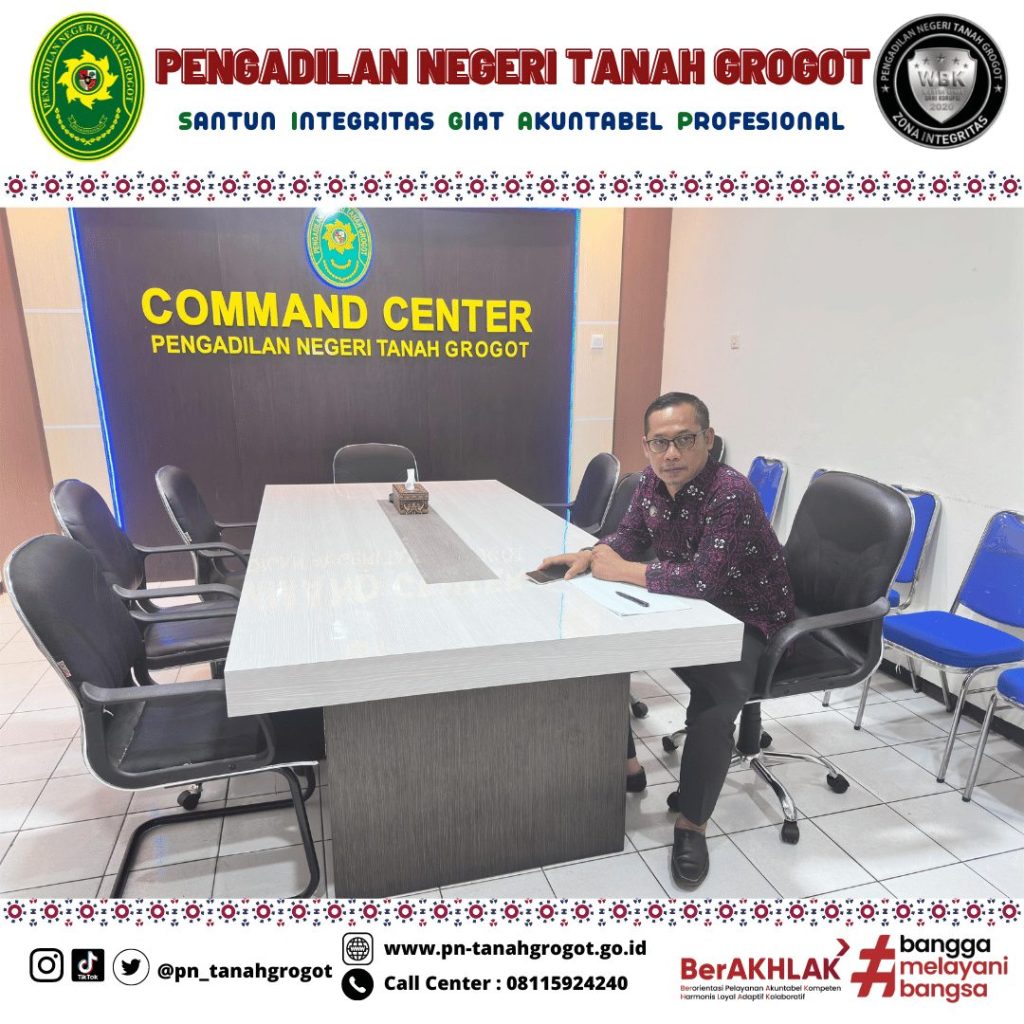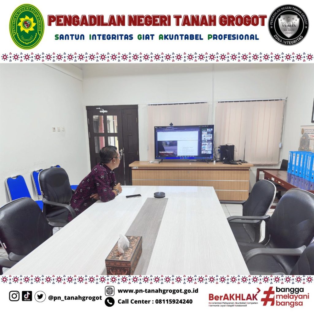 Bertempat di ruang Command Center Pengadilan Negeri Tanah Grogot, Muhyidin, S.H. selaku Kepala Sub Bagian Umum dan Keuangan Pengadilan Negeri Tanah Grogot mengikuti kegiatan “Sosialisasi Pembayaran Tunjangan Kinerja pada Awal Bulan” yang diselenggarakan oleh Badan Urusan Administrasi (BUA) Mahkamah Agung RI secara daring. Kegiatan tersebut diikuti oleh seluruh satuan kerja dari 4 (empat) Lingkungan Peradilan di Bawah Mahkamah Agung RI.