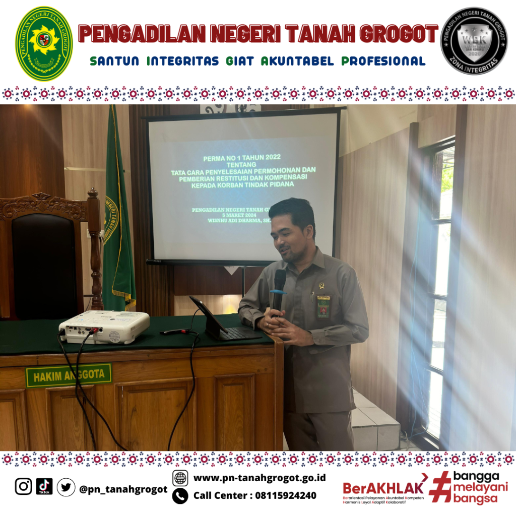 Bertempat di Ruang Sidang Utama Pengadilan Negeri Tanah Grogot, telah dilaksanakan Sosialisasi PERMA No. 1 Tahun 2022 tentang Tata Cara Penyelesaian Permohonan dan Pemberian Restitusi dan Kompensasi Kepada Korban Tindak Pidana, PERMA No. 2 Tahun 2022 tentang Tata Cara Penyelesaian Keberatan Pihak Ketiga yang Beriktikad Baik terhadap Putusan Perampasan Barang Bukan Kepunyaan Terdakwa dalam Perkara Tindak Pidana Korupsi, dan PERMA No. 3 Tahun 2022 tentang Mediasi di Pengadilan secara Elektronik. Acara sosialisasi dibawakan oleh Hakim Pengadilan Negeri Tanah Grogot, Bapak Wisnhu Adi Dharma, S.H. Sosialisasi ini diikuti oleh Bagian Kepaniteraan Pengadilan Negeri Tanah Grogot.