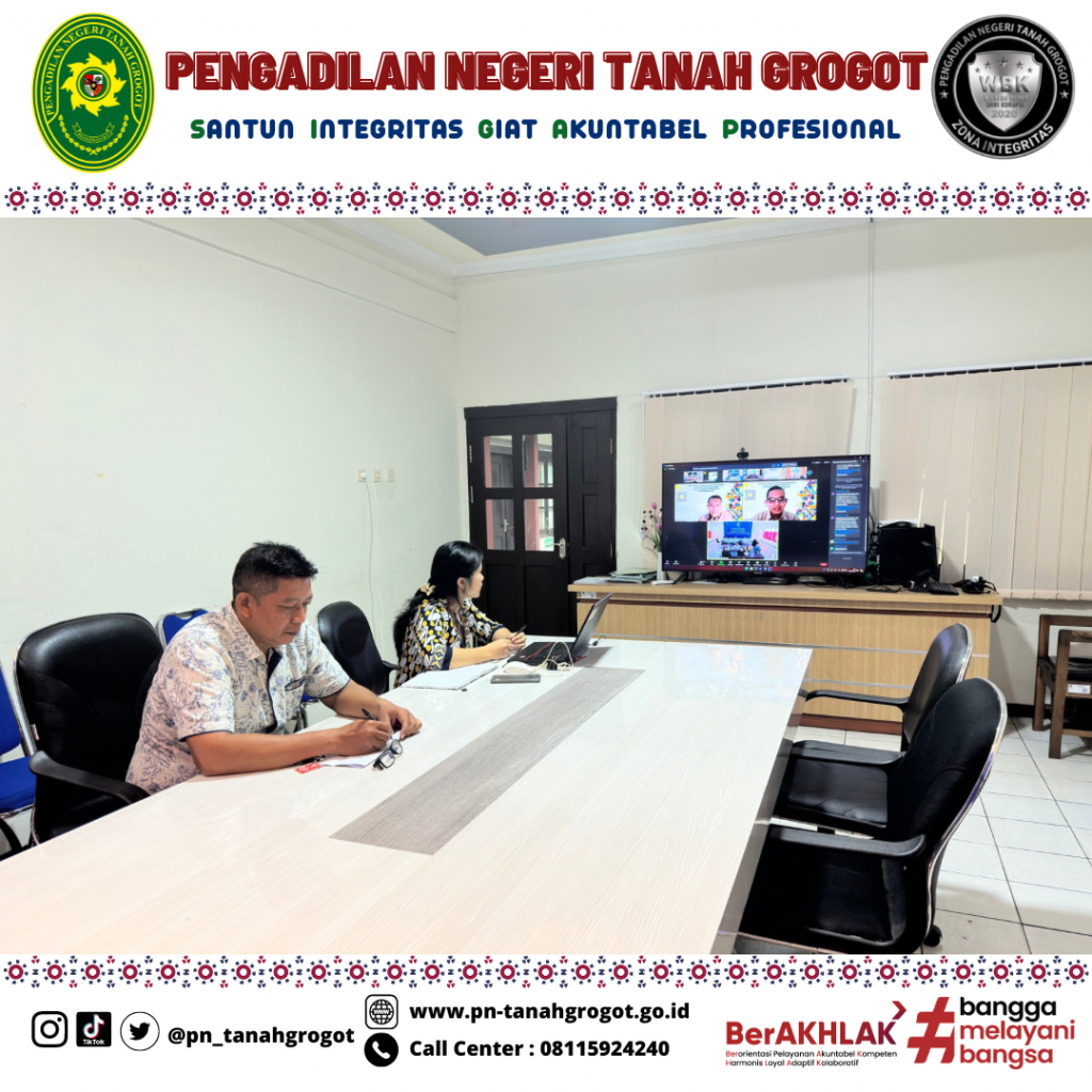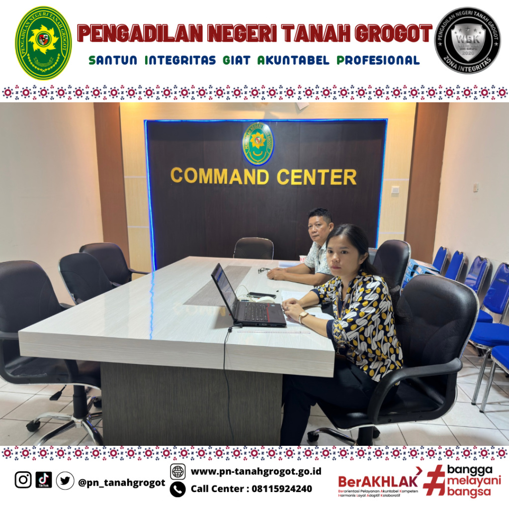 Bertempat di ruang command center Pengadilan Negeri Tanah Grogot dilaksanakan Sosialisasi Petunjuk Teknis Pengusulan RKBMN Tahun Anggaran 2026. Kegiatan ini dihadiri oleh seluruh satuan kerja di Lingkungan Mahkamah Agung dan Badan Peradilan di Bawahnya secara Online. Kegiatan sosialisasi ini diikuti oleh Sekretaris Pengadilan Negeri Tanah Grogot Bapak Sugianto, S.H. dan Operator BMN, Ibu Arjudus Sada Arihta Angkat, A.Md.