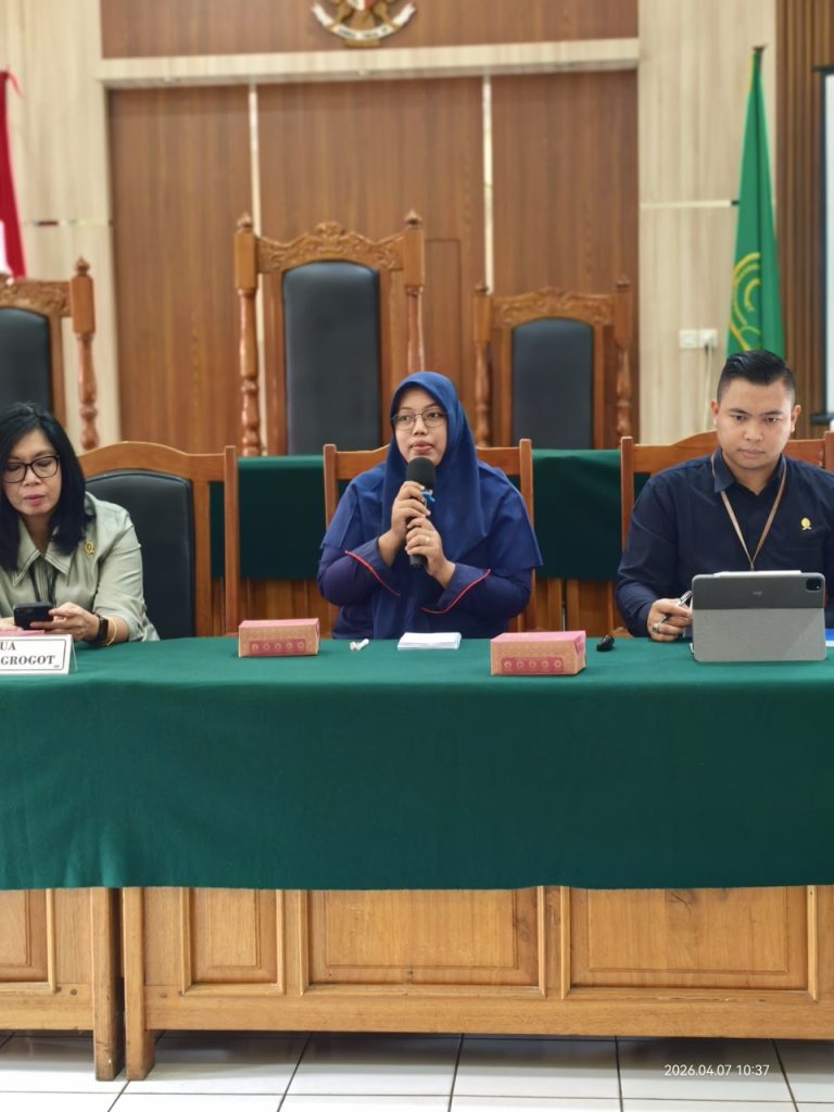Pada hari Selasa tanggal 7 April 2026 pukul 10.00 WITA bertempat di Ruang Sidang Utama Pengadilan Negeri Tanah Grogot telah diadakan Sosialisasi SEMA Nomor 1 Tahun 2023 tentang Tata Cara Panggilan dan Pemberitahuan Melalui Surat Tercatat dan Instruksi Dirjen Badilum Nomor 2 Tahun 2024 tentang Petunjuk Pelaksanaan Surat Tercatat Dalam Proses Penanganan Perkara Pada Pengadilan Di Lingkungan Peradilan Umum serta Monitoring dan Evaluasi terhadap Pelaksanaan Pengiriman Melalui Surat Tercatat.