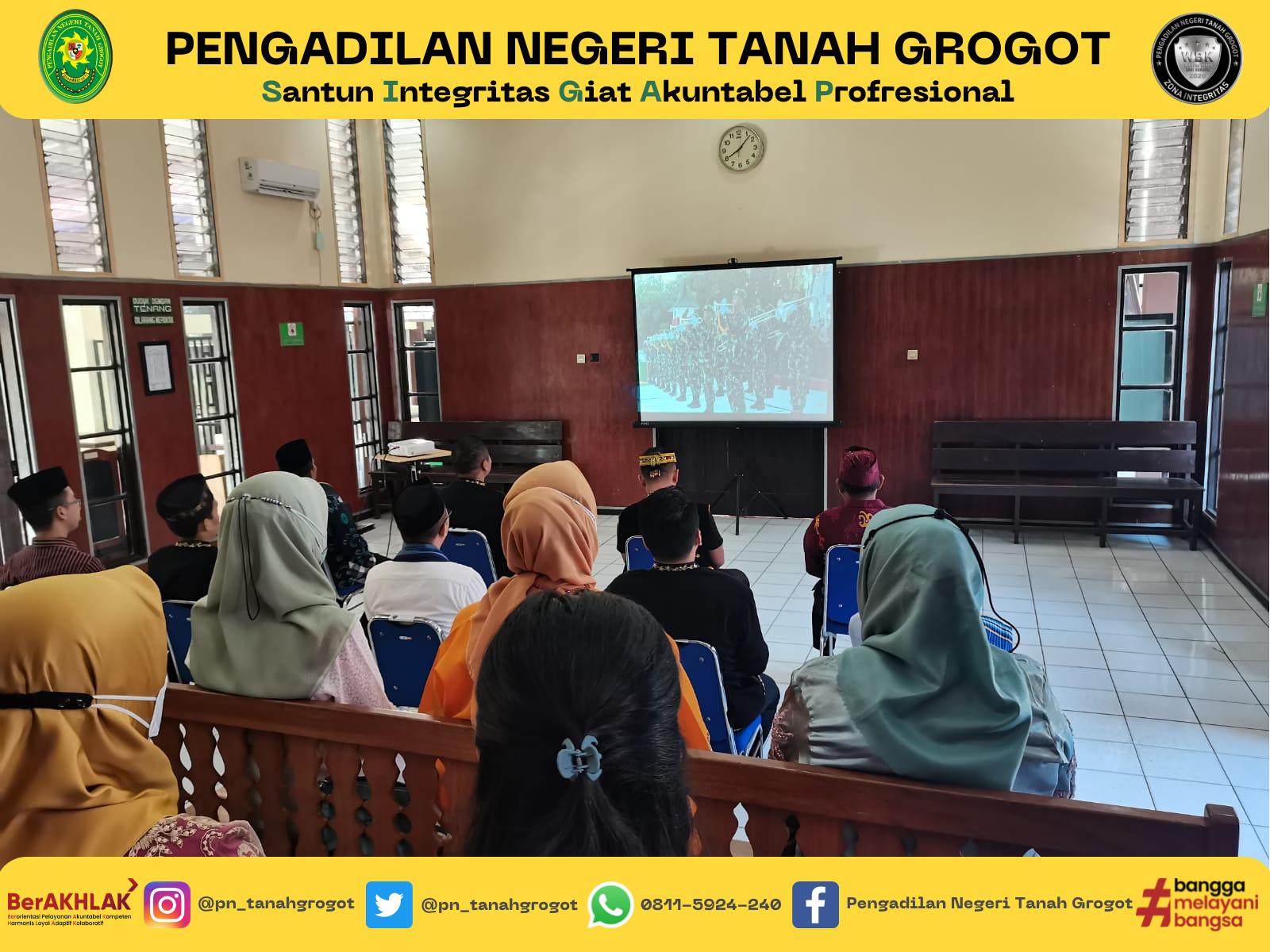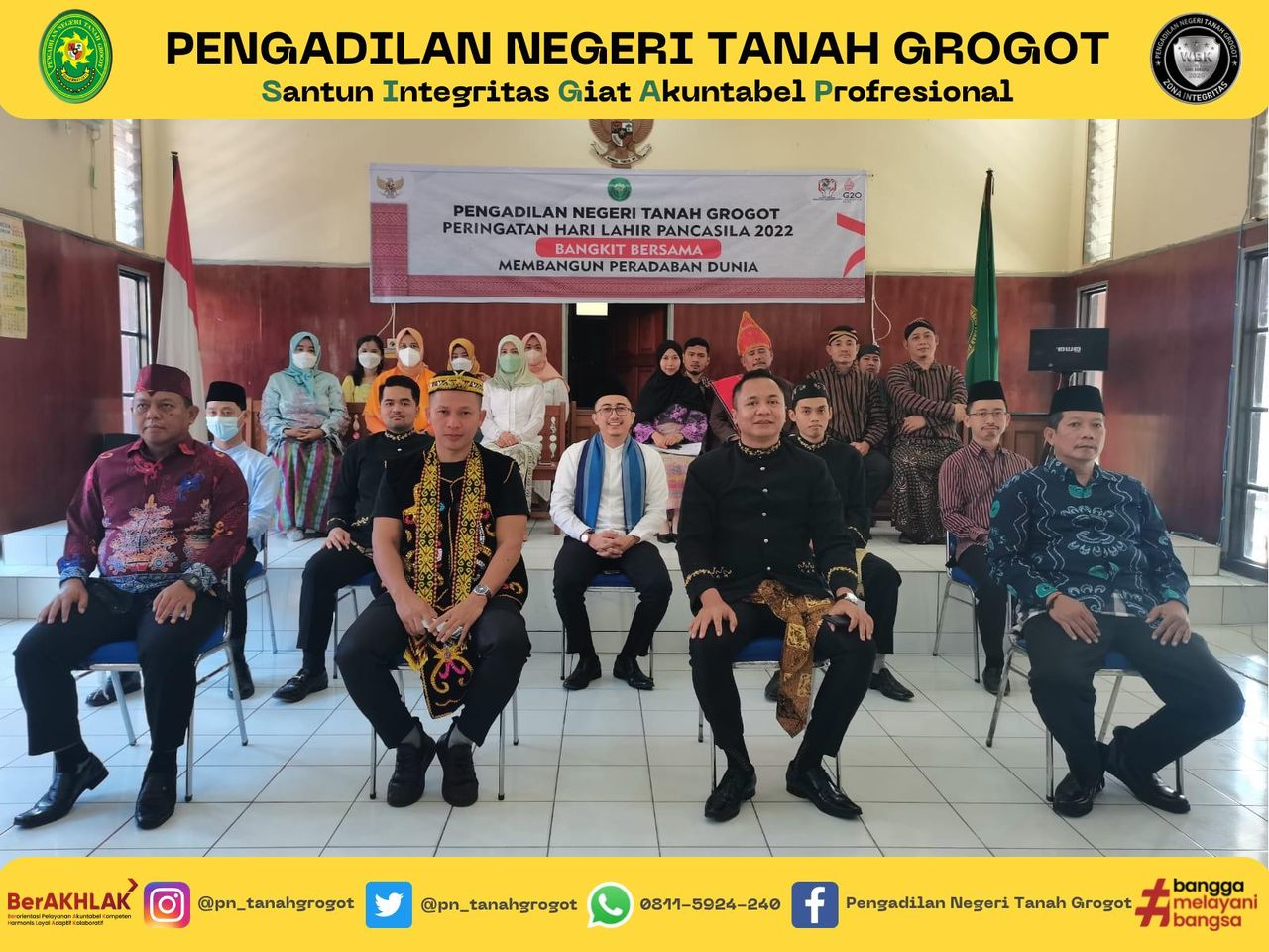 Bertempat di Ruang Sidang Utama Pengadilan Negeri Tanah Grogot Kelas II, Ketua Pengadilan Negeri Tanah Grogot, Bpk. Made Adicandra Purnawan, S.H. beserta dengan Wakil Ketua Pengadilan Negeri Tanah Grogot, Bpk. Moch Isa Nazarudin, S.H., M.H., Para Hakim, Panitera, Sekretaris, Pejabat Struktural, Pejabat Fungsional, dan Para Staff Pengadilan Negeri Tanah Grogot mengikuti upacara memperingati hari kelahiran pancasila secara virtual, dengan mengenakan pakaian adat dari berbagai daerah yang ada di Indonesia.