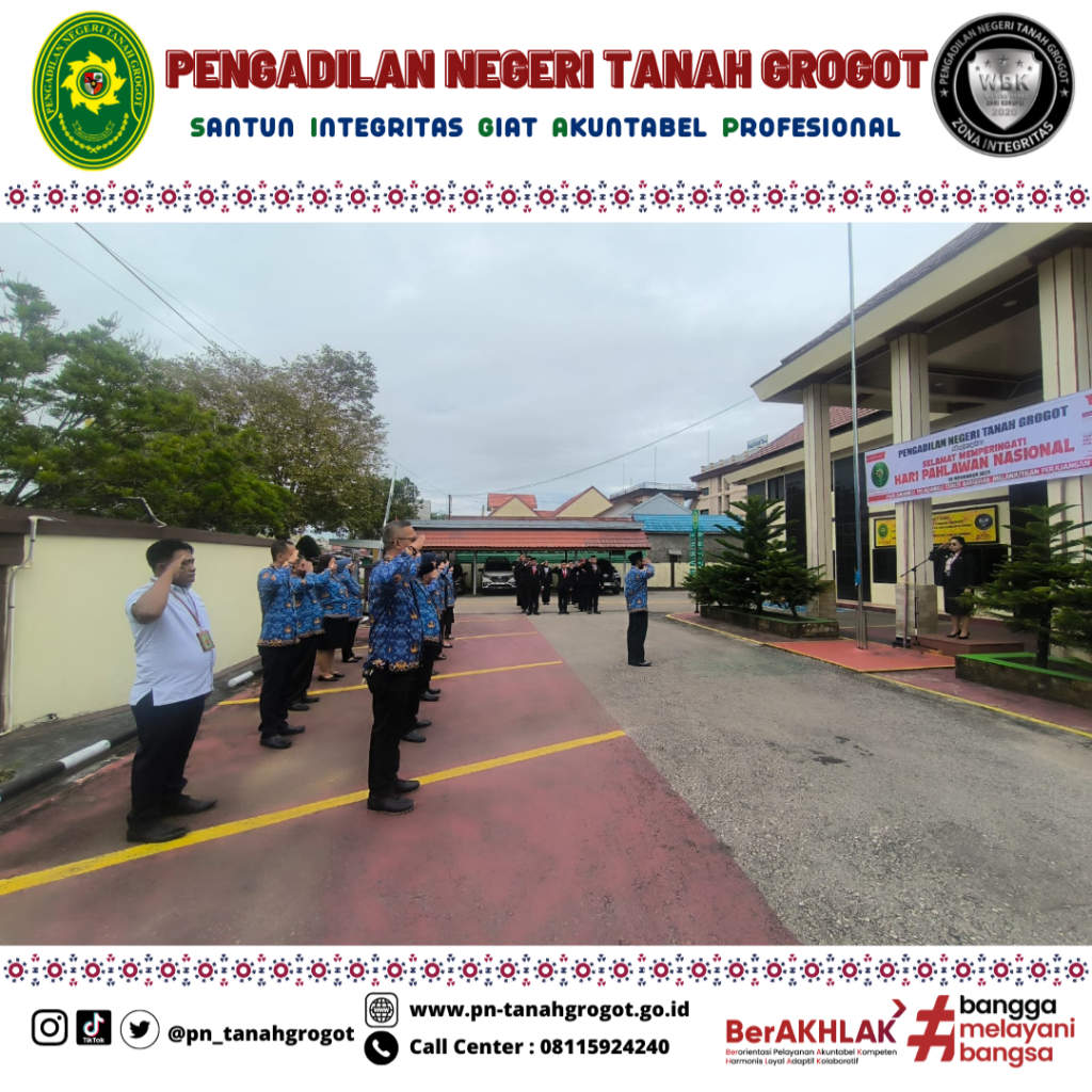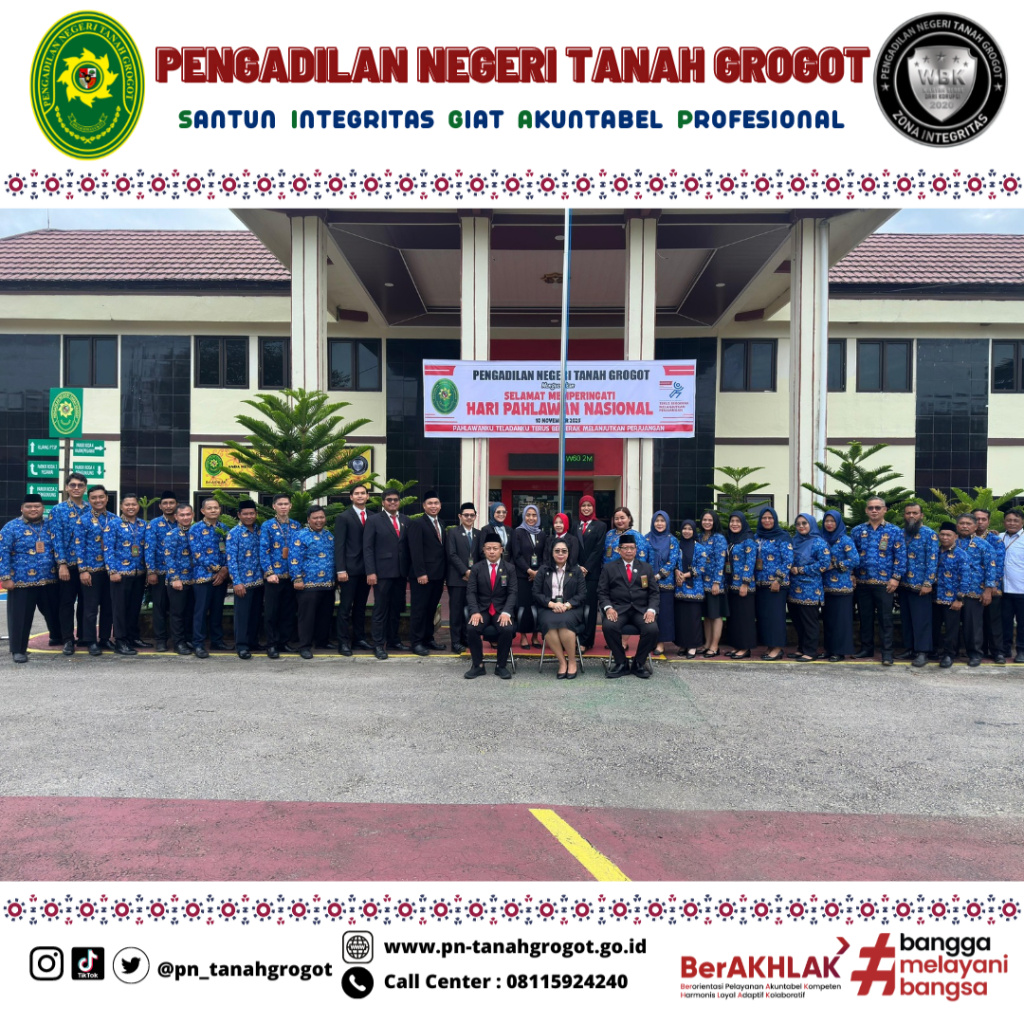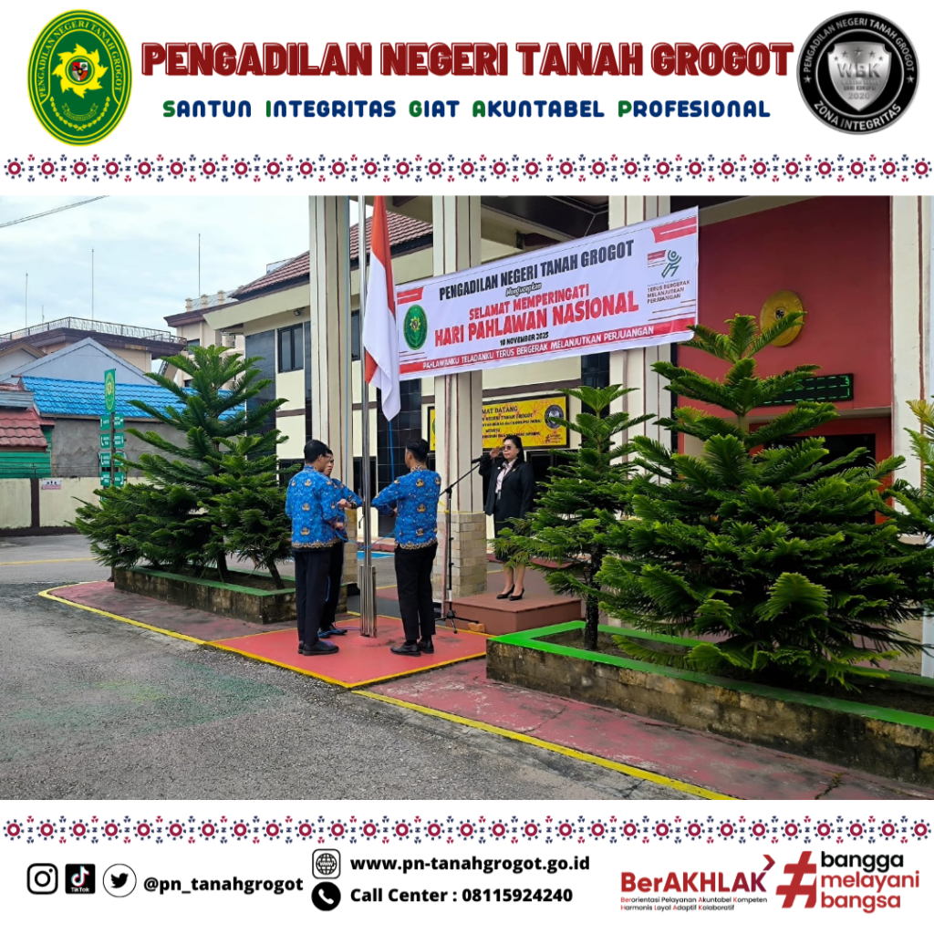 Pada hari Senin tanggal 10 November 2025 pukul 08.00 WITA Pengadilan Negeri Tanah Grogot menyelenggarakan Upacara Bendera dalam rangka Peringatan Hari Pahlawan di halaman Kantor Pengadilan Negeri Tanah Grogot. Adapun tema Hari Pahlawan Tahun 2025 adalah “Pahlawanku Teladanku Terus Bergerak Melanjutkan Perjuangan” dan susunan acaranya antara lain Pengibaran Bendera Merah Putih diiringi lagu Kebangsaan Indonesia Raya, Mengheningkan Cipta, Pembacaan Teks Pancasila, Pembacaan Teks Pembukaan Undang-Undang Dasar Negara Kesatuan Republik Indonesia Tahun 1945, Pembacaan Pesan-Pesan Perjuangan Pahlawan Nasional, Pembacaan Doa dan diakhiri dengan Foto Bersama. Dalam pelaksanaan upacara tersebut dipimpin oleh Ketua Pengadilan Negeri Tanah Grogot Ibu Ari Listyawati, S.H., M.H. dengan peserta upacara terdiri dari seluruh Hakim dan Aparatur Sipil Negara (ASN) Pengadilan Negeri Tanah Grogot.